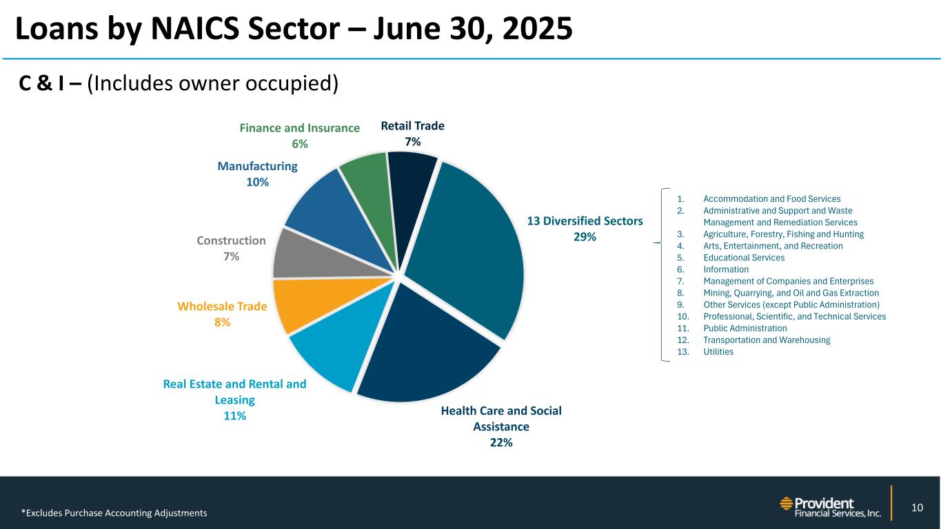 NYSE: PFS C & I – (Includes owner occupied)* Loans by NAICS Sector – 06/30/25 24*Excludes Purchase Accounting Adjustments NAIC Industry Code Loan Count Exposure ($) 62: Health Care and Social Assistance 719 $1,085,200,878 53: Real Estate and Rental and Leasing 1,262 $564,796,510 81: Other Services (except Public Administration) 797 $417,796,780 42: Wholesale Trade 351 $374,729,299 23: Construction 817 $338,205,416 32: Manufacturing 182 $333,812,500 52: Finance and Insurance 200 $324,043,403 44: Retail Trade 285 $238,696,190 61: Educational Services 175 $234,420,593 71: Arts, Entertainment, and Recreation 182 $178,079,474 72: Accommodation and Food Services 267 $176,827,491 33: Manufacturing 149 $137,935,043 54: Professional, Scientific, and Technical Services 489 $123,261,748 56: Administrative and Support and Waste Management and Remediation Services 246 $97,834,410 45: Retail Trade 159 $97,094,124 48: Transportation and Warehousing 226 $79,296,526 55: Management of Companies and Enterprises 121 $53,734,045 31: Manufacturing 77 $48,586,816 51: Information 28 $29,119,400 22: Utilities 26 $22,254,645 All Other 1,327 $31,975,838 Grand Total 8,085 $4,987,701,126