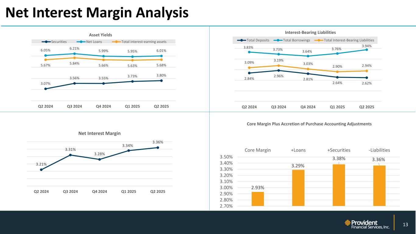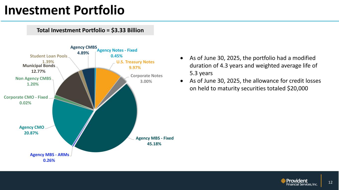 NYSE: PFS Agency Notes - Fixed 0.45% U.S. Treasury Notes 9.97% Corporate Notes 3.00% Agency MBS - Fixed 45.18% Agency MBS - ARMs 0.26% Agency CMO 20.87% Corporate CMO - Fixed 0.02% Non Agency CMBS 1.20% Municipal Bonds 12.77% Student Loan Pools 1.39% Agency CMBS 4.89% Investment Portfolio 12 Total Investment Portfolio = $3.33 Billion • As of June 30, 2025, the portfolio had a modified duration of 4.3 years and weighted average life of 5.3 years • As of June 30, 2025, the allowance for credit losses on held to maturity securities totaled $20,000