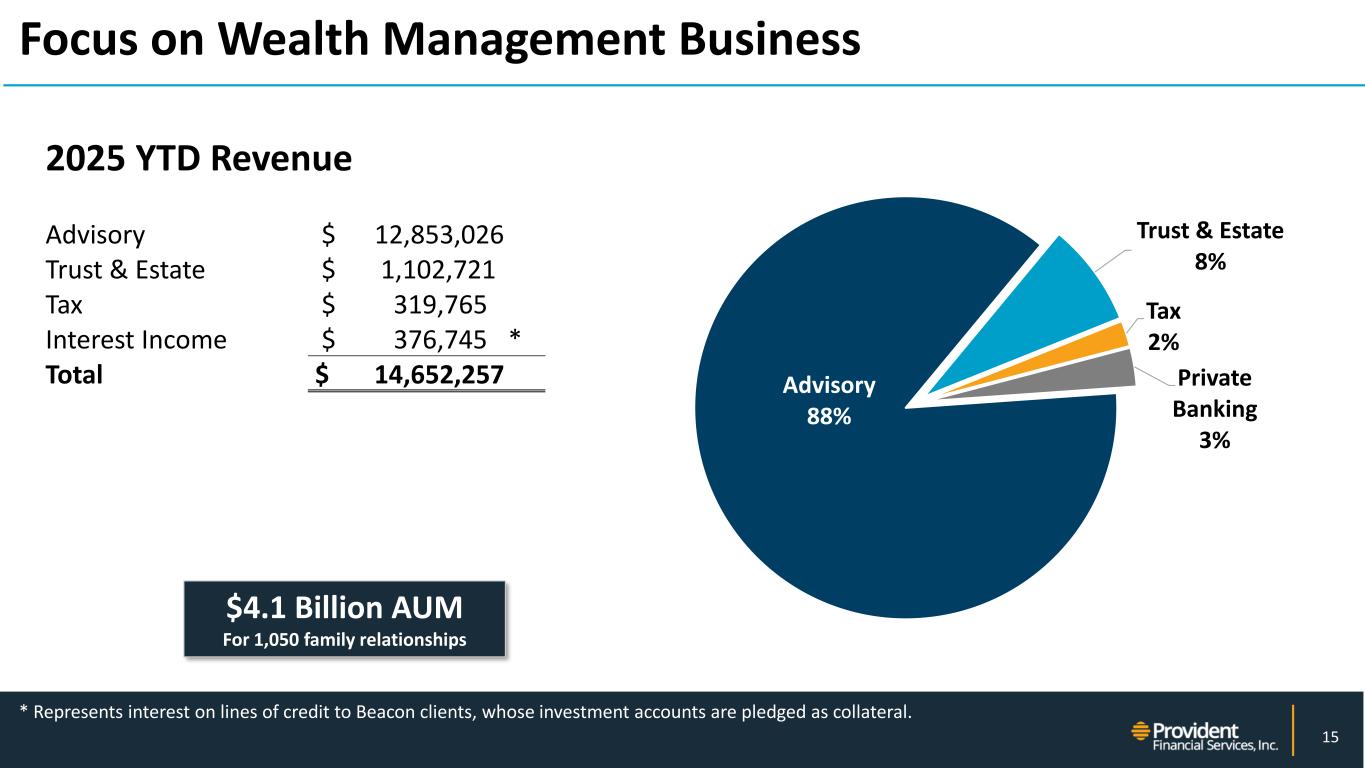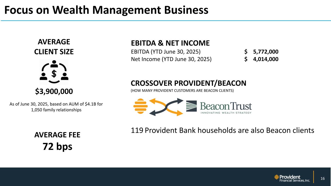 NYSE: PFS * Represents interest on lines of credit to Beacon clients, whose investment accounts are pledged as collateral. Advisory 88% Trust & Estate 8% Tax 2% Private Banking 3% Focus on Wealth Management Business 15 $4.1 Billion AUM For 1,050 family relationships 2025 YTD Revenue Advisory $ 12,853,026 Trust & Estate $ 1,102,721 Tax $ 319,765 Interest Income $ 376,745 * Total $ 14,652,257
