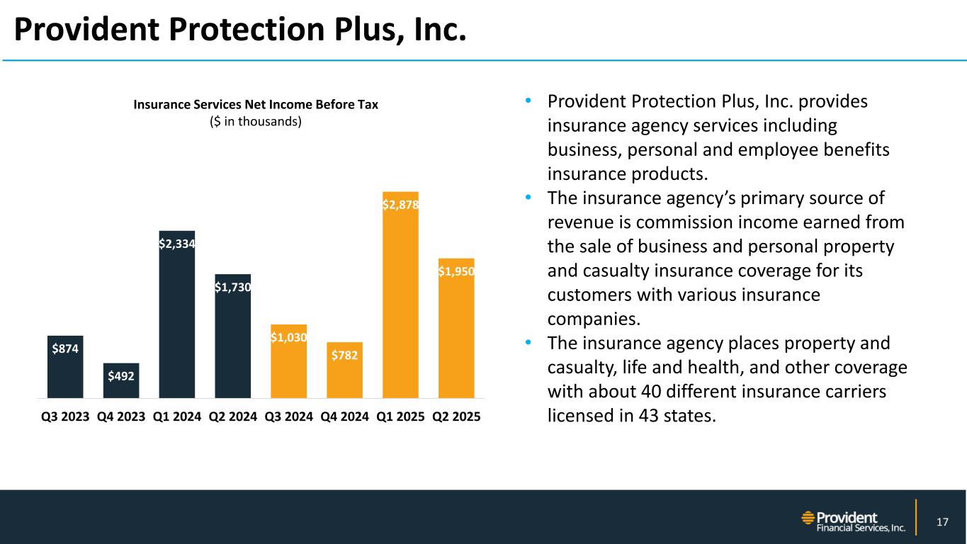 NYSE: PFS • Provident Protection Plus, Inc. provides insurance agency services including business, personal and employee benefits insurance products. • The insurance agency’s primary source of revenue is commission income earned from the sale of business and personal property and casualty insurance coverage for its customers with various insurance companies. • The insurance agency places property and casualty, life and health, and other coverage with about 40 different insurance carriers licensed in 43 states. Provident Protection Plus, Inc. 17 $874 $492 $2,334 $1,730 $1,030 $782 $2,878 $1,950 Q3 2023 Q4 2023 Q1 2024 Q2 2024 Q3 2024 Q4 2024 Q1 2025 Q2 2025 Insurance Services Net Income Before Tax ($ in thousands)