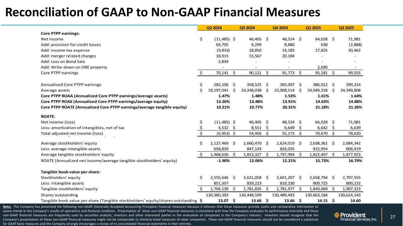 NYSE: PFS Note: The Company has presented the following non-GAAP (Generally Accepted Accounting Principles) financial measures because it believes that these measures provide useful and comparative information to assess trends in the Company’s results of operations and financial condition. Presentation of these non-GAAP financial measures is consistent with how the Company evaluates its performance internally and these non-GAAP financial measures are frequently used by securities analysts, investors and other interested parties in the evaluation of companies in the Company’s industry. Investors should recognize that the Company’s presentation of these non-GAAP financial measures might not be comparable to similarly-titled measures of other companies. These non-GAAP financial measures should not be considered a substitute for GAAP basis measures and the Company strongly encourages a review of its consolidated financial statements in their entirety. ($ in thousands, except per share data) Reconciliation of GAAP to Non-GAAP Financial Measures 26 Annualized Adjusted Return on Average Assets, Equity and Tangible Equity June 30, March 31, June 30, 2025 2025 2024 Net Income 71,981$ 64,029$ (11,485)$ Write-down on ORE Property - 2,690 Merger-related transaction costs - - 18,915 Less: income tax expense - (809) (4,625) Annualized adjusted net income 71,981$ 65,910$ 2,805$ Less: Amortization of Intangibles (net of tax) 6,639$ 6,642$ 4,532$ Annualized adjusted net income for annualized adjusted return 78,620$ 72,552$ 7,337$ Annualized Adjusted Return on Average Assets 1.19% 1.11% 0.06% Annualized Adjusted Return on Average Equity 10.76% 10.13% 0.53% Annualized Adjusted Return on Average Tangible Equity 16.79% 16.15% 2.01% Three Months Ended