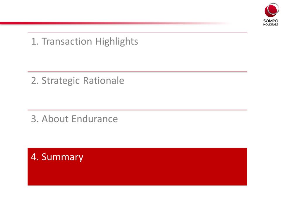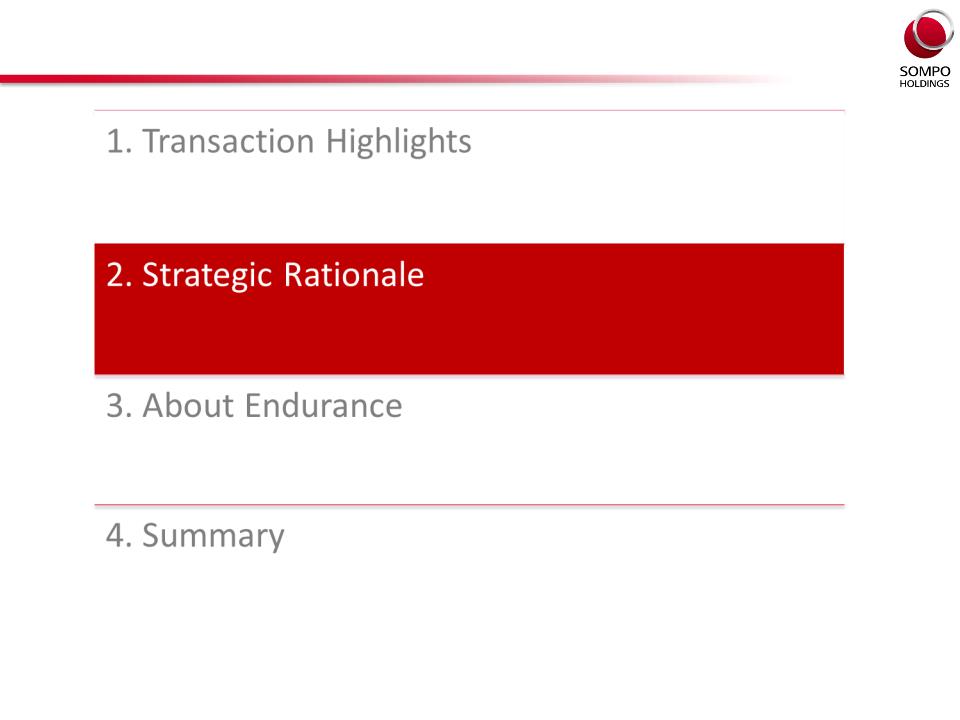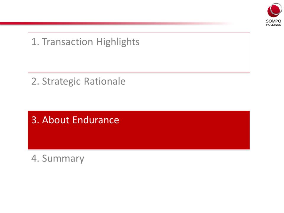 So what exactly are we acquiring in this operation? Endurance is a specialty insurance group with experience of management and underwriters excellence, and this transaction enables us to establish a truly integrated global insurance business, but the key attributes that have made this business attractive to ourselves, are many, but among many, in summary we are acquiring a business with a high growth profile and strong underwriting capabilities, a business which has demonstrated stable profitability in the regions market, a business with robust covenants in place and operated by best in class management.