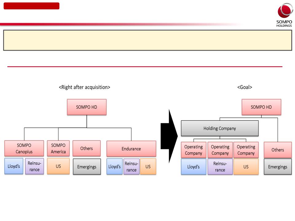 KS: If you take a look at page four of our chart, you will see that structural concepts of how we are going to be integrated, right now we have structure like you have on the left side going to the right side, and the point is we are discussing to establish a holding company to manage control, operating company and operating lawyers and the insurance in the US and this does not necessarily mean only overseas companies. It may include Japanese subsidiaries as well, and in this holding company subject to the approval of my Board, will be controlled, managed by very, very limited people, maybe for instance three to make sure that a decision will be taken, and the right timing, and I am thinking this company will be headed by John, and the other two, among the three the other two will be sent from the Sompo side, whom I am still thinking, but two plus one will be good enough. This is very important because this company, the holding company is not one to poke their nose into the nitty gritty things of each operation, but overseas and direct, broad direction and make sure that integration is taking place, that is why there is no need for us to have more than three people when we have him.