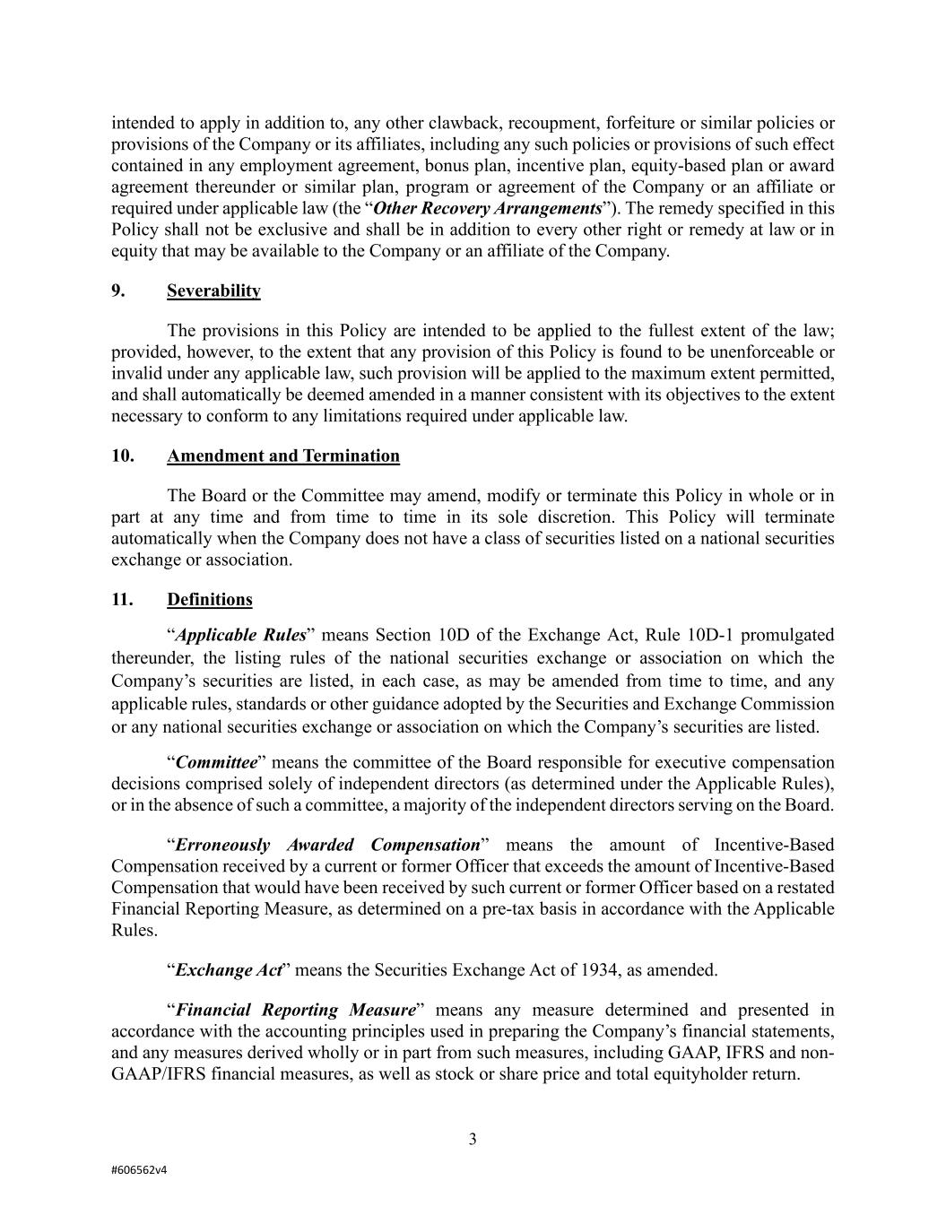 3 #606562v4 intended to apply in addition to, any other clawback, recoupment, forfeiture or similar policies or provisions of the Company or its affiliates, including any such policies or provisions of such effect contained in any employment agreement, bonus plan, incentive plan, equity-based plan or award agreement thereunder or similar plan, program or agreement of the Company or an affiliate or required under applicable law (the “Other Recovery Arrangements”). The remedy specified in this Policy shall not be exclusive and shall be in addition to every other right or remedy at law or in equity that may be available to the Company or an affiliate of the Company. 9. Severability The provisions in this Policy are intended to be applied to the fullest extent of the law; provided, however, to the extent that any provision of this Policy is found to be unenforceable or invalid under any applicable law, such provision will be applied to the maximum extent permitted, and shall automatically be deemed amended in a manner consistent with its objectives to the extent necessary to conform to any limitations required under applicable law. 10. Amendment and Termination The Board or the Committee may amend, modify or terminate this Policy in whole or in part at any time and from time to time in its sole discretion. This Policy will terminate automatically when the Company does not have a class of securities listed on a national securities exchange or association. 11. Definitions “Applicable Rules” means Section 10D of the Exchange Act, Rule 10D-1 promulgated thereunder, the listing rules of the national securities exchange or association on which the Company’s securities are listed, in each case, as may be amended from time to time, and any applicable rules, standards or other guidance adopted by the Securities and Exchange Commission or any national securities exchange or association on which the Company’s securities are listed. “Committee” means the committee of the Board responsible for executive compensation decisions comprised solely of independent directors (as determined under the Applicable Rules), or in the absence of such a committee, a majority of the independent directors serving on the Board. “Erroneously Awarded Compensation” means the amount of Incentive-Based Compensation received by a current or former Officer that exceeds the amount of Incentive-Based Compensation that would have been received by such current or former Officer based on a restated Financial Reporting Measure, as determined on a pre-tax basis in accordance with the Applicable Rules. “Exchange Act” means the Securities Exchange Act of 1934, as amended. “Financial Reporting Measure” means any measure determined and presented in accordance with the accounting principles used in preparing the Company’s financial statements, and any measures derived wholly or in part from such measures, including GAAP, IFRS and non- GAAP/IFRS financial measures, as well as stock or share price and total equityholder return.