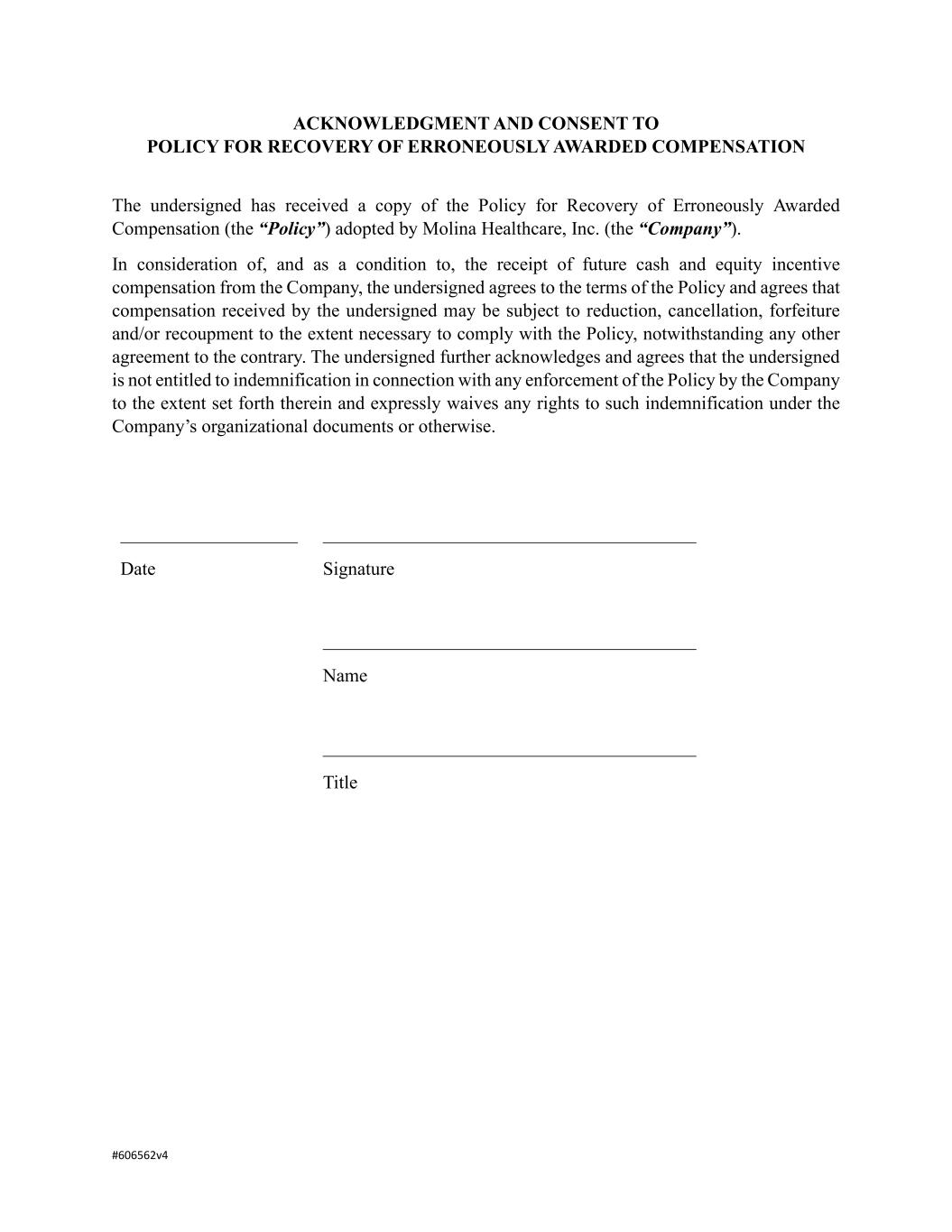 #606562v4 ACKNOWLEDGMENT AND CONSENT TO POLICY FOR RECOVERY OF ERRONEOUSLY AWARDED COMPENSATION The undersigned has received a copy of the Policy for Recovery of Erroneously Awarded Compensation (the “Policy”) adopted by Molina Healthcare, Inc. (the “Company”). In consideration of, and as a condition to, the receipt of future cash and equity incentive compensation from the Company, the undersigned agrees to the terms of the Policy and agrees that compensation received by the undersigned may be subject to reduction, cancellation, forfeiture and/or recoupment to the extent necessary to comply with the Policy, notwithstanding any other agreement to the contrary. The undersigned further acknowledges and agrees that the undersigned is not entitled to indemnification in connection with any enforcement of the Policy by the Company to the extent set forth therein and expressly waives any rights to such indemnification under the Company’s organizational documents or otherwise. ___________________ Date ________________________________________ Signature ________________________________________ Name ________________________________________ Title