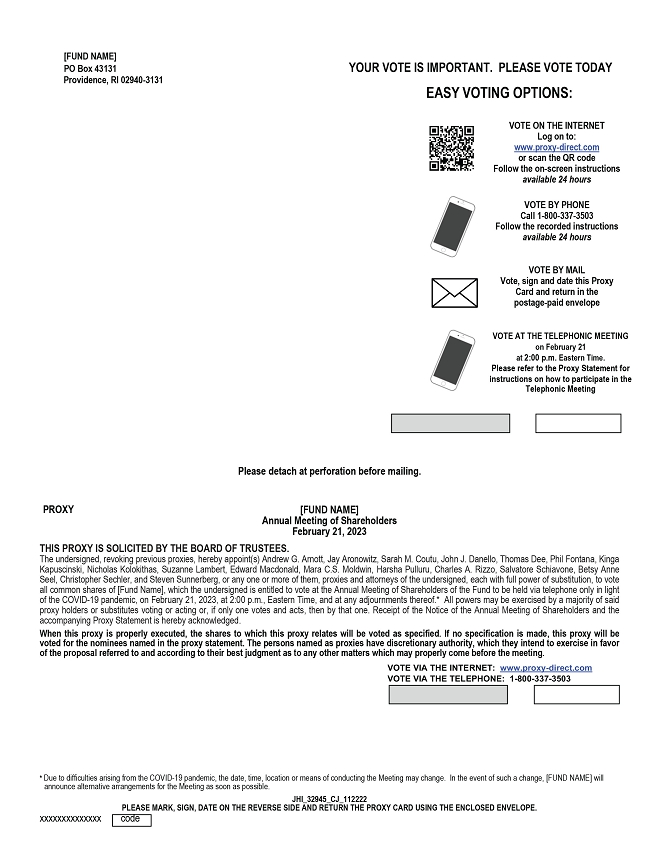 You are invited to attend your fund’s annual shareholder meeting. The meeting will be held via telephone only in light of the COVID-19 pandemic, on Tuesday, February 21, 2023, at 2:00 P.M., Eastern time.