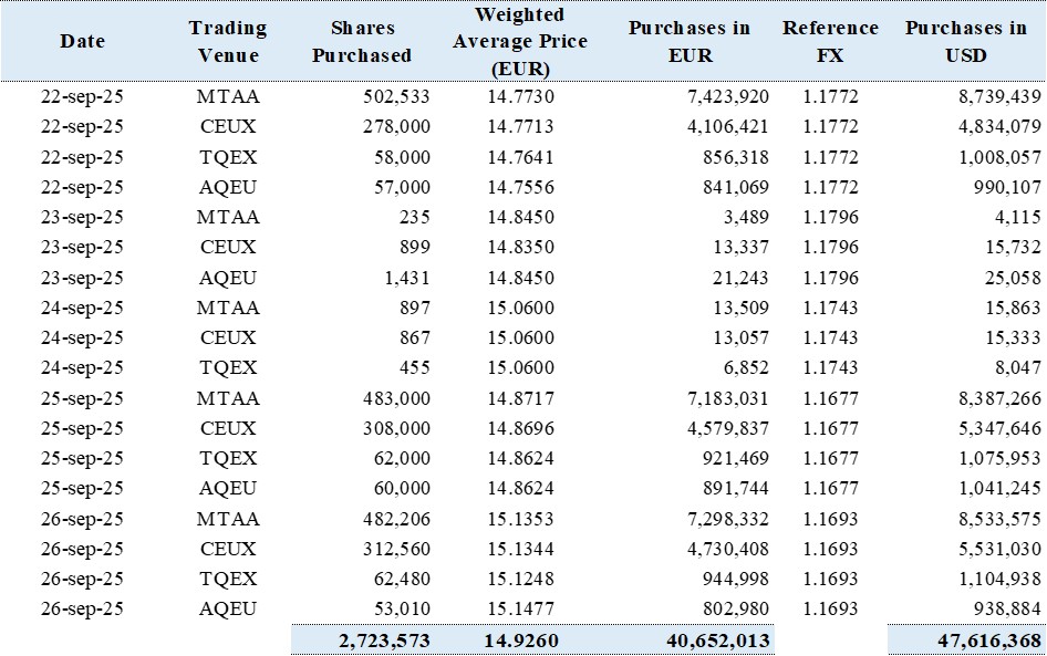 From September 22, 2025 to (and including) September 26, 2025, the Company has purchased a total of 2,723,573 ordinary shares for a total consideration of €40,652,013, equivalent to USD47,616,368.