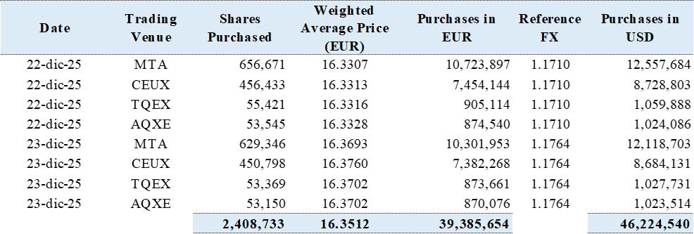 From December 22, 2025 to (and including) December 26, 2025, the Company has purchased a total of 2,408,733 ordinary shares for a total consideration of €39,385,654 equivalent to USD46,224,540.