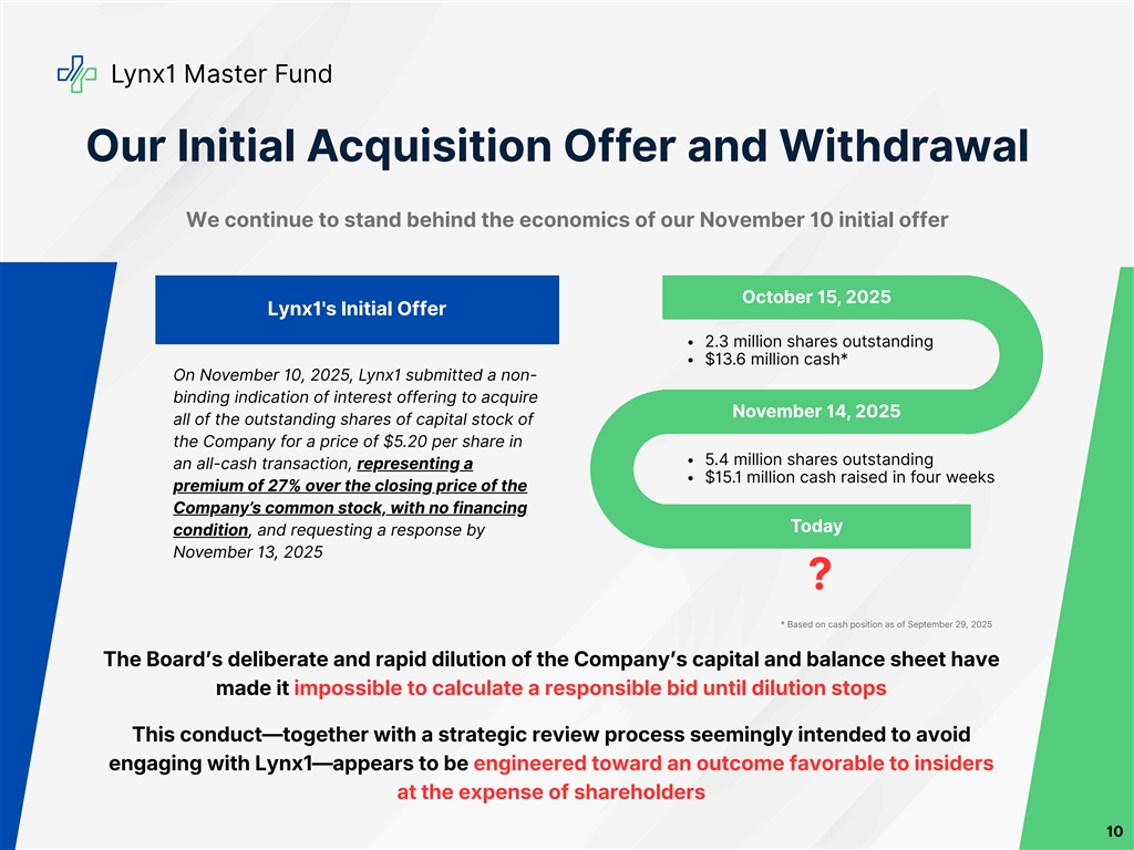 Lynx1 Master Fund Our Initial Acquisition Offer and Withdrawal We continue to stand behind the economics of our November 10 initial offer October 15, 2025 Lynx1's Initial Offer 2.3 million shares outstanding $13.6 million cash* On November 10, 2025, Lynx1 submitted a non- binding indication of interest offering to acquire November 14, 2025 all of the outstanding shares of capital stock of the Company for a price of $5.20 per share in 5.4 million shares outstanding an all-cash transaction, representing a $15.1 million cash raised in four weeks premium of 27% over the closing price of the Company’s common stock, with no financing Today condition, and requesting a response by November 13, 2025 ? * Based on cash position as of September 29, 2025 The Boardʼs deliberate and rapid dilution of the Companyʼs capital and balance sheet have made it impossible to calculate a responsible bid until dilution stops This conduct—together with a strategic review process seemingly intended to avoid engaging with Lynx1—appears to be engineered toward an outcome favorable to insiders at the expense of shareholders 10