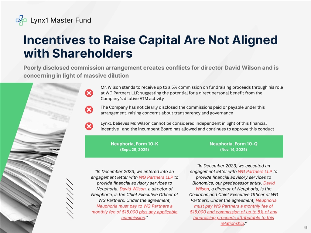 Lynx1 Master Fund Incentives to Raise Capital Are Not Aligned with Shareholders Poorly disclosed commission arrangement creates conflicts for director David Wilson and is concerning in light of massive dilution Mr. Wilson stands to receive up to a 5% commission on fundraising proceeds through his role at WG Partners LLP, suggesting the potential for a direct personal benefit from the Company’s dilutive ATM activity The Company has not clearly disclosed the commissions paid or payable under this arrangement, raising concerns about transparency and governance Lynx1 believes Mr. Wilson cannot be considered independent in light of this financial incentive—and the incumbent Board has allowed and continues to approve this conduct Neuphoria, Form 10-K Neuphoria, Form 10-Q (Sept. 29, 2025) (Nov. 14, 2025) “In December 2023, we executed an “In December 2023, we entered into an engagement letter with WG Partners LLP to engagement letter with WG Partners LLP to provide financial advisory services to provide financial advisory services to Bionomics, our predecessor entity. David Neuphoria. David Wilson, a director of Wilson, a director of Neuphoria, is the Neuphoria, is the Chief Executive Officer of Chairman and Chief Executive Officer of WG WG Partners. Under the agreement, Partners. Under the agreement, Neuphoria Neuphoria must pay to WG Partners a must pay WG Partners a monthly fee of monthly fee of $15,000 plus any applicable $15,000 and commission of up to 5% of any commission.” fundraising proceeds attributable to this relationship.” 11