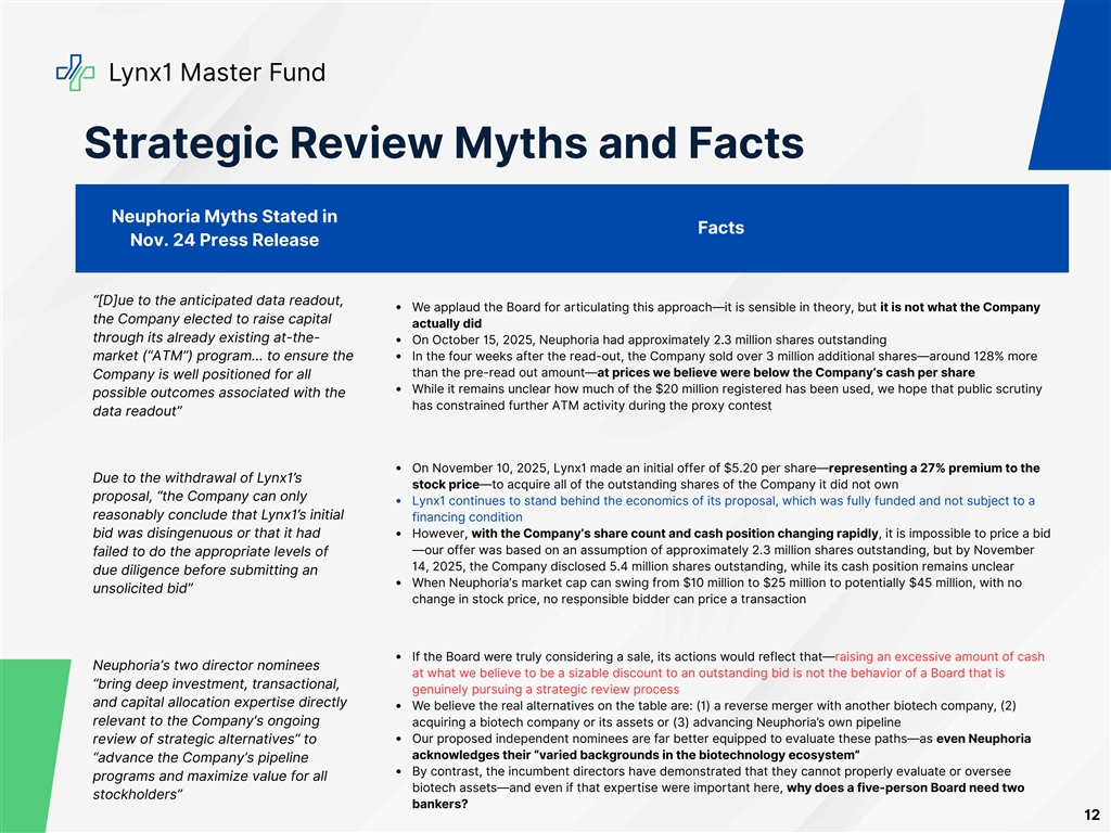 Lynx1 Master Fund Strategic Review Myths and Facts Neuphoria Myths Stated in Facts Nov. 24 Press Release “[D]ue to the anticipated data readout, We applaud the Board for articulating this approach—it is sensible in theory, but it is not what the Company the Company elected to raise capital actually did through its already existing at-the- On October 15, 2025, Neuphoria had approximately 2.3 million shares outstanding market (“ATM”) program… to ensure the In the four weeks after the read-out, the Company sold over 3 million additional shares—around 128% more than the pre-read out amount—at prices we believe were below the Company’s cash per share Company is well positioned for all While it remains unclear how much of the $20 million registered has been used, we hope that public scrutiny possible outcomes associated with the has constrained further ATM activity during the proxy contest data readout” On November 10, 2025, Lynx1 made an initial offer of $5.20 per share—representing a 27% premium to the Due to the withdrawal of Lynx1’s stock price—to acquire all of the outstanding shares of the Company it did not own proposal, “the Company can only Lynx1 continues to stand behind the economics of its proposal, which was fully funded and not subject to a reasonably conclude that Lynx1’s initial financing condition bid was disingenuous or that it had However, with the Company’s share count and cash position changing rapidly, it is impossible to price a bid —our offer was based on an assumption of approximately 2.3 million shares outstanding, but by November failed to do the appropriate levels of 14, 2025, the Company disclosed 5.4 million shares outstanding, while its cash position remains unclear due diligence before submitting an When Neuphoria’s market cap can swing from $10 million to $25 million to potentially $45 million, with no unsolicited bid” change in stock price, no responsible bidder can price a transaction If the Board were truly considering a sale, its actions would reflect that—raising an excessive amount of cash Neuphoria’s two director nominees at what we believe to be a sizable discount to an outstanding bid is not the behavior of a Board that is “bring deep investment, transactional, genuinely pursuing a strategic review process and capital allocation expertise directly We believe the real alternatives on the table are: (1) a reverse merger with another biotech company, (2) relevant to the Company’s ongoing acquiring a biotech company or its assets or (3) advancing Neuphoria’s own pipeline Our proposed independent nominees are far better equipped to evaluate these paths—as even Neuphoria review of strategic alternatives” to acknowledges their “varied backgrounds in the biotechnology ecosystem” “advance the Company’s pipeline By contrast, the incumbent directors have demonstrated that they cannot properly evaluate or oversee programs and maximize value for all biotech assets—and even if that expertise were important here, why does a five-person Board need two stockholders” bankers? 12