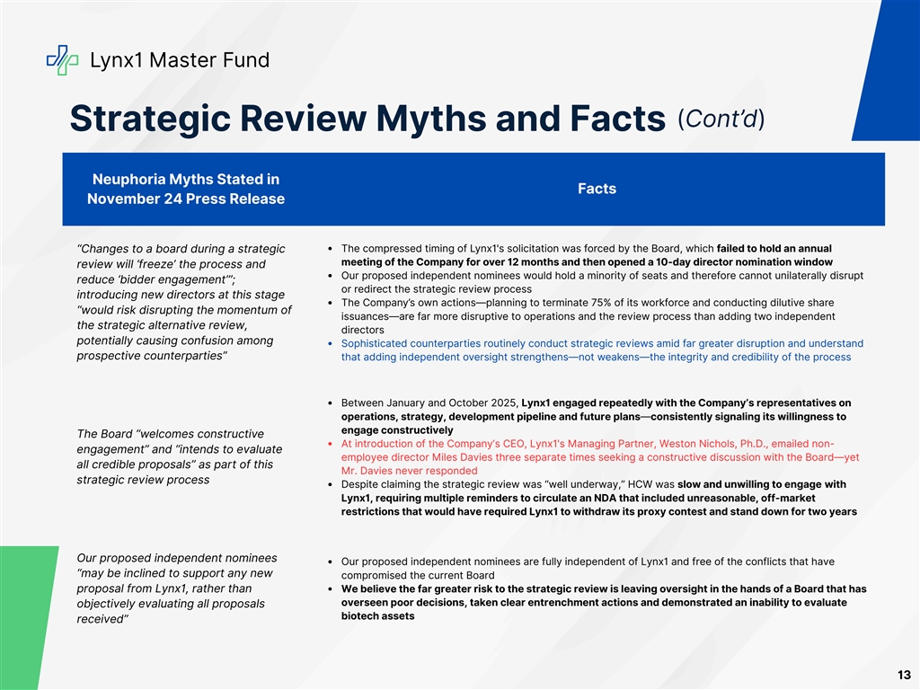 Lynx1 Master Fund (Cont’d) Strategic Review Myths and Facts Neuphoria Myths Stated in Facts November 24 Press Release “Changes to a board during a strategic The compressed timing of Lynx1's solicitation was forced by the Board, which failed to hold an annual meeting of the Company for over 12 months and then opened a 10-day director nomination window review will ‘freeze’ the process and Our proposed independent nominees would hold a minority of seats and therefore cannot unilaterally disrupt reduce ‘bidder engagement’”; or redirect the strategic review process introducing new directors at this stage The Company’s own actions—planning to terminate 75% of its workforce and conducting dilutive share “would risk disrupting the momentum of issuances—are far more disruptive to operations and the review process than adding two independent the strategic alternative review, directors potentially causing confusion among Sophisticated counterparties routinely conduct strategic reviews amid far greater disruption and understand prospective counterparties” that adding independent oversight strengthens—not weakens—the integrity and credibility of the process Between January and October 2025, Lynx1 engaged repeatedly with the Company’s representatives on operations, strategy, development pipeline and future plans—consistently signaling its willingness to engage constructively The Board “welcomes constructive At introduction of the Company’s CEO, Lynx1's Managing Partner, Weston Nichols, Ph.D., emailed non- engagement” and “intends to evaluate employee director Miles Davies three separate times seeking a constructive discussion with the Board—yet all credible proposals” as part of this Mr. Davies never responded strategic review process Despite claiming the strategic review was “well underway,” HCW was slow and unwilling to engage with Lynx1, requiring multiple reminders to circulate an NDA that included unreasonable, off-market restrictions that would have required Lynx1 to withdraw its proxy contest and stand down for two years Our proposed independent nominees Our proposed independent nominees are fully independent of Lynx1 and free of the conflicts that have “may be inclined to support any new compromised the current Board proposal from Lynx1, rather than We believe the far greater risk to the strategic review is leaving oversight in the hands of a Board that has overseen poor decisions, taken clear entrenchment actions and demonstrated an inability to evaluate objectively evaluating all proposals biotech assets received” 13