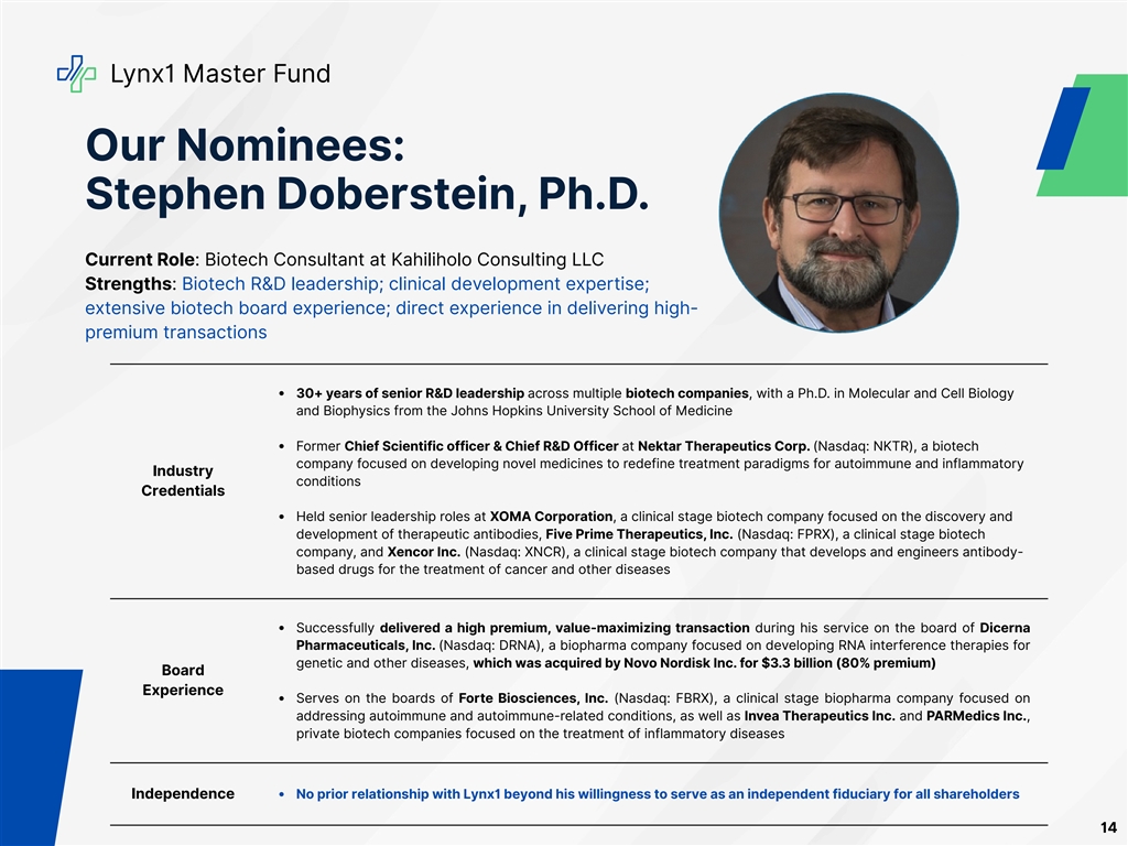 Lynx1 Master Fund Our Nominees: Stephen Doberstein, Ph.D. Current Role: Biotech Consultant at Kahiliholo Consulting LLC Strengths: Biotech R&D leadership; clinical development expertise; extensive biotech board experience; direct experience in delivering high- premium transactions 30+ years of senior R&D leadership across multiple biotech companies, with a Ph.D. in Molecular and Cell Biology and Biophysics from the Johns Hopkins University School of Medicine Former Chief Scientific officer & Chief R&D Officer at Nektar Therapeutics Corp. (Nasdaq: NKTR), a biotech company focused on developing novel medicines to redefine treatment paradigms for autoimmune and inflammatory Industry conditions Credentials Held senior leadership roles at XOMA Corporation, a clinical stage biotech company focused on the discovery and development of therapeutic antibodies, Five Prime Therapeutics, Inc. (Nasdaq: FPRX), a clinical stage biotech company, and Xencor Inc. (Nasdaq: XNCR), a clinical stage biotech company that develops and engineers antibody- based drugs for the treatment of cancer and other diseases Successfully delivered a high premium, value-maximizing transaction during his service on the board of Dicerna Pharmaceuticals, Inc. (Nasdaq: DRNA), a biopharma company focused on developing RNA interference therapies for genetic and other diseases, which was acquired by Novo Nordisk Inc. for $3.3 billion (80% premium) Board Experience Serves on the boards of Forte Biosciences, Inc. (Nasdaq: FBRX), a clinical stage biopharma company focused on addressing autoimmune and autoimmune-related conditions, as well as Invea Therapeutics Inc. and PARMedics Inc., private biotech companies focused on the treatment of inflammatory diseases Independence No prior relationship with Lynx1 beyond his willingness to serve as an independent fiduciary for all shareholders 14
