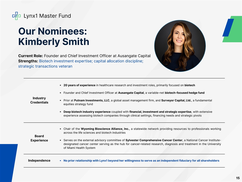 Lynx1 Master Fund Our Nominees: Kimberly Smith Current Role: Founder and Chief Investment Officer at Ausangate Capital Strengths: Biotech investment expertise; capital allocation discipline; strategic transactions veteran 20 years of experience in healthcare research and investment roles, primarily focused on biotech Founder and Chief Investment Officer at Ausangate Capital, a variable-net biotech-focused hedge fund Industry Prior at Putnam Investments, LLC, a global asset management firm, and Surveyor Capital, Ltd., a fundamental Credentials equities strategy fund Deep biotech industry experience coupled with financial, investment and strategic expertise, with extensive experience assessing biotech companies through clinical settings, financing needs and strategic pivots Chair of the Wyoming Bioscience Alliance, Inc., a statewide network providing resources to professionals working across the life sciences and biotech industries Board Serves on the external advisory committee of Sylvester Comprehensive Cancer Center, a National Cancer Institute- Experience designated cancer center serving as the hub for cancer-related research, diagnosis and treatment in the University of Miami Health System Independence No prior relationship with Lynx1 beyond her willingness to serve as an independent fiduciary for all shareholders 15