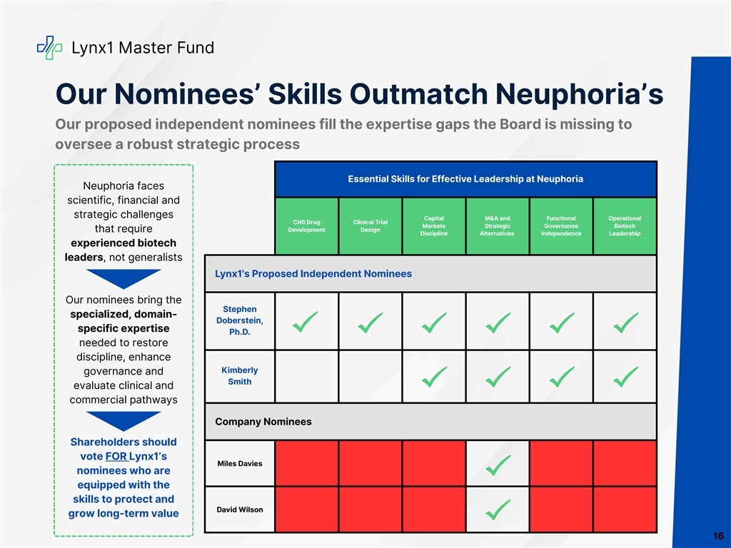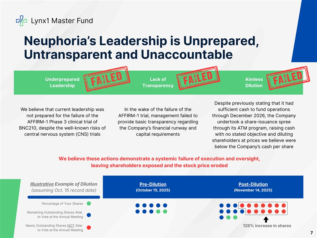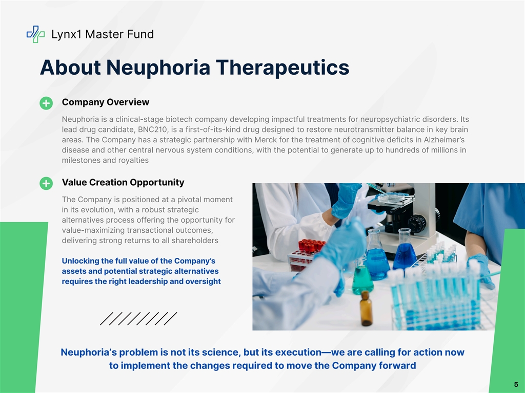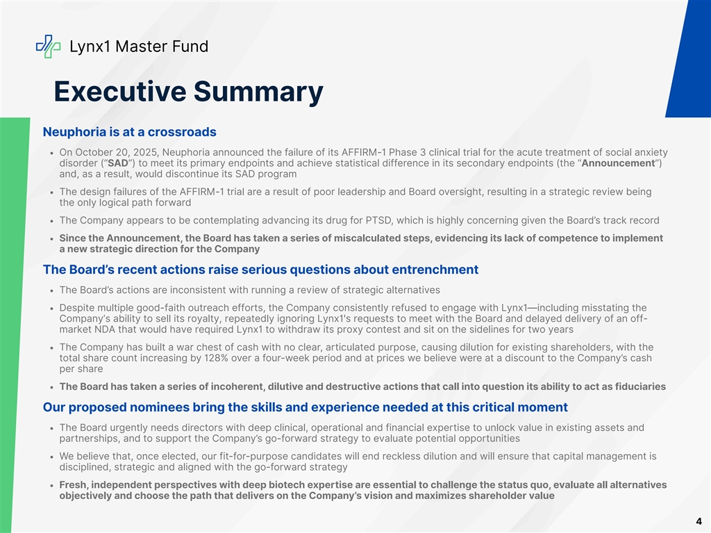 Lynx1 Master Fund Executive Summary Neuphoria is at a crossroads On October 20, 2025, Neuphoria announced the failure of its AFFIRM-1 Phase 3 clinical trial for the acute treatment of social anxiety disorder (“SAD”) to meet its primary endpoints and achieve statistical difference in its secondary endpoints (the “Announcement”) and, as a result, would discontinue its SAD program The design failures of the AFFIRM-1 trial are a result of poor leadership and Board oversight, resulting in a strategic review being the only logical path forward The Company appears to be contemplating advancing its drug for PTSD, which is highly concerning given the Board’s track record Since the Announcement, the Board has taken a series of miscalculated steps, evidencing its lack of competence to implement a new strategic direction for the Company The Board’s recent actions raise serious questions about entrenchment The Board’s actions are inconsistent with running a review of strategic alternatives Despite multiple good-faith outreach efforts, the Company consistently refused to engage with Lynx1—including misstating the Company’s ability to sell its royalty, repeatedly ignoring Lynx1's requests to meet with the Board and delayed delivery of an off- market NDA that would have required Lynx1 to withdraw its proxy contest and sit on the sidelines for two years The Company has built a war chest of cash with no clear, articulated purpose, causing dilution for existing shareholders, with the total share count increasing by 128% over a four-week period and at prices we believe were at a discount to the Company’s cash per share The Board has taken a series of incoherent, dilutive and destructive actions that call into question its ability to act as fiduciaries Our proposed nominees bring the skills and experience needed at this critical moment The Board urgently needs directors with deep clinical, operational and financial expertise to unlock value in existing assets and partnerships, and to support the Company’s go-forward strategy to evaluate potential opportunities We believe that, once elected, our fit-for-purpose candidates will end reckless dilution and will ensure that capital management is disciplined, strategic and aligned with the go-forward strategy Fresh, independent perspectives with deep biotech expertise are essential to challenge the status quo, evaluate all alternatives objectively and choose the path that delivers on the Company’s vision and maximizes shareholder value 4