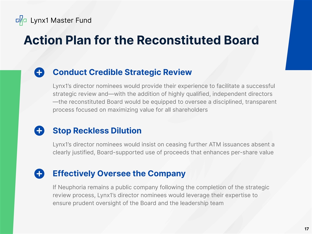Lynx1 Master Fund Action Plan for the Reconstituted Board Conduct Credible Strategic Review Lynx1’s director nominees would provide their experience to facilitate a successful strategic review and—with the addition of highly qualified, independent directors —the reconstituted Board would be equipped to oversee a disciplined, transparent process focused on maximizing value for all shareholders Stop Reckless Dilution Lynx1’s director nominees would insist on ceasing further ATM issuances absent a clearly justified, Board-supported use of proceeds that enhances per-share value Effectively Oversee the Company If Neuphoria remains a public company following the completion of the strategic review process, Lynx1’s director nominees would leverage their expertise to ensure prudent oversight of the Board and the leadership team 17