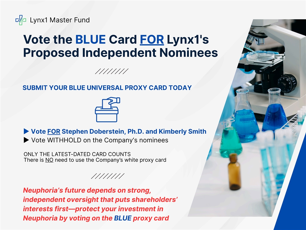 Lynx1 Master Fund Vote the BLUE Card FOR Lynx1's Proposed Independent Nominees SUBMIT YOUR BLUE UNIVERSAL PROXY CARD TODAY ▶ Vote FOR Stephen Doberstein, Ph.D. and Kimberly Smith ▶ Vote WITHHOLD on the Company’s nominees ONLY THE LATEST-DATED CARD COUNTS There is NO need to use the Company’s white proxy card Neuphoria’s future depends on strong, independent oversight that puts shareholders’ interests first—protect your investment in Neuphoria by voting on the BLUE proxy card