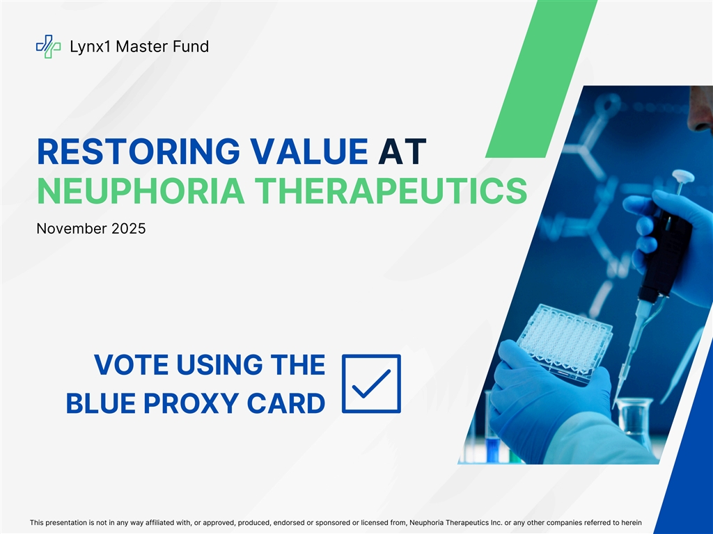 Lynx1 Master Fund RESTORING VALUE AT NEUPHORIA THERAPEUTICS November 2025 VOTE USING THE BLUE PROXY CARD This presentation is not in any way affiliated with, or approved, produced, endorsed or sponsored or licensed from, Neuphoria Therapeutics Inc. or any other companies referred to herein