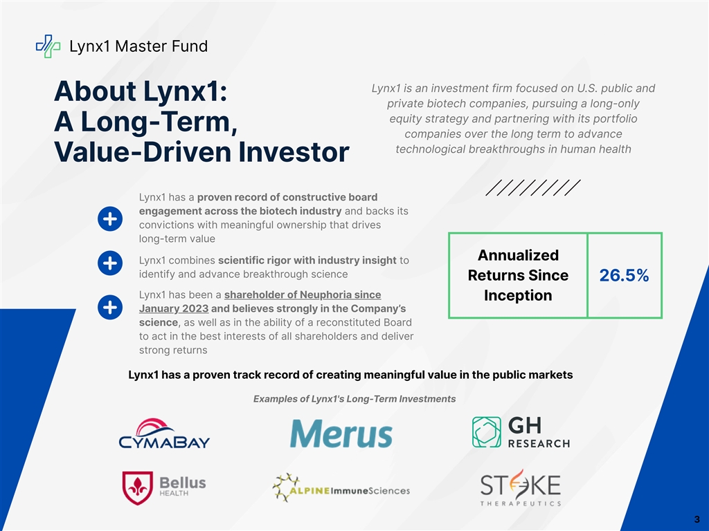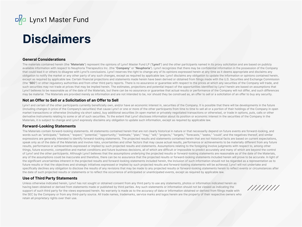 Lynx1 Master Fund Disclaimers General Considerations The materials contained herein (the “Materials”) represent the opinions of Lynx1 Master Fund LP (“Lynx1”) and the other participants named in its proxy solicitation and are based on publicly available information with respect to Neuphoria Therapeutics Inc. (the “Company” or “Neuphoria”). Lynx1 recognizes that there may be confidential information in the possession of the Company that could lead it or others to disagree with Lynx1’s conclusions. Lynx1 reserves the right to change any of its opinions expressed herein at any time as it deems appropriate and disclaims any obligation to notify the market or any other party of any such changes, except as required by applicable law. Lynx1 disclaims any obligation to update the information or opinions contained herein, except as required by applicable law. Certain financial projections and statements made herein have been derived or obtained from filings made with the U.S. Securities and Exchange Commission (the “SEC”) or other regulatory authorities and from other third party reports. There is no assurance or guarantee with respect to the prices at which any securities of the Company will trade, and such securities may not trade at prices that may be implied herein. The estimates, projections and potential impact of the opportunities identified by Lynx1 herein are based on assumptions that Lynx1 believes to be reasonable as of the date of the Materials, but there can be no assurance or guarantee that actual results or performance of the Company will not differ, and such differences may be material. The Materials are provided merely as information and are not intended to be, nor should they be construed as, an offer to sell or a solicitation of an offer to buy any security. Not an Offer to Sell or a Solicitation of an Offer to Sell Lynx1 and certain of the other participants currently beneficially own, and/or have an economic interest in, securities of the Company. It is possible that there will be developments in the future (including changes in price of the Company’s securities) that cause Lynx1 or one or more of the other participants from time to time to sell all or a portion of their holdings of the Company in open market transactions or otherwise (including via short sales), buy additional securities (in open market or privately negotiated transactions or otherwise), or trade in options, puts, calls or other derivative instruments relating to some or all of such securities. To the extent that Lynx1 discloses information about its position or economic interest in the securities of the Company in the Materials, it is subject to change and Lynx1 expressly disclaims any obligation to update such information, except as required by applicable law. Forward-Looking Statements The Materials contain forward-looking statements. All statements contained herein that are not clearly historical in nature or that necessarily depend on future events are forward-looking, and words such as “anticipate,” “believe,” “expect,” “potential,” “opportunity,” “estimate,” “plan,” “may,” “will,” “projects,” “targets,” “forecasts,” “seeks,” “could”, and the negatives thereof, and similar expressions are generally intended to identify forward-looking statements. The projected results and statements contained herein that are not historical facts are based on current expectations, speak only as of the date of the Materials and involve risks, uncertainties and other factors that may cause actual results, performance or achievements to be materially different from any future results, performance or achievements expressed or implied by such projected results and statements. Assumptions relating to the foregoing involve judgments with respect to, among other things, future economic, competitive and market conditions and future business decisions, all of which are difficult or impossible to predict accurately and many of which are beyond the control of Lynx1 and the other participants. Although Lynx1 believes that the assumptions underlying the projected results or forward-looking statements are reasonable as of the date of the Materials, any of the assumptions could be inaccurate and therefore, there can be no assurance that the projected results or forward-looking statements included herein will prove to be accurate. In light of the significant uncertainties inherent in the projected results and forward-looking statements included herein, the inclusion of such information should not be regarded as a representation as to future results or that the objectives and strategic initiatives expressed or implied by such projected results and forward-looking statements will be achieved. Lynx1 will not undertake and specifically declines any obligation to disclose the results of any revisions that may be made to any projected results or forward-looking statements herein to reflect events or circumstances after the date of such projected results or statements or to reflect the occurrence of anticipated or unanticipated events, except as required by applicable law. Use of Third Party Statements Unless otherwise indicated herein, Lynx1 has not sought or obtained consent from any third party to use any statements, photos or information indicated herein as having been obtained or derived from statements made or published by third parties. Any such statements or information should not be viewed as indicating the support of such third party for the views expressed herein. No warranty is made as to the accuracy of data or information obtained or derived from filings made with the SEC by the Company or from any third-party source. All trade names, trademarks, service marks and logos herein are the property of their respective owners who retain all proprietary rights over their use.