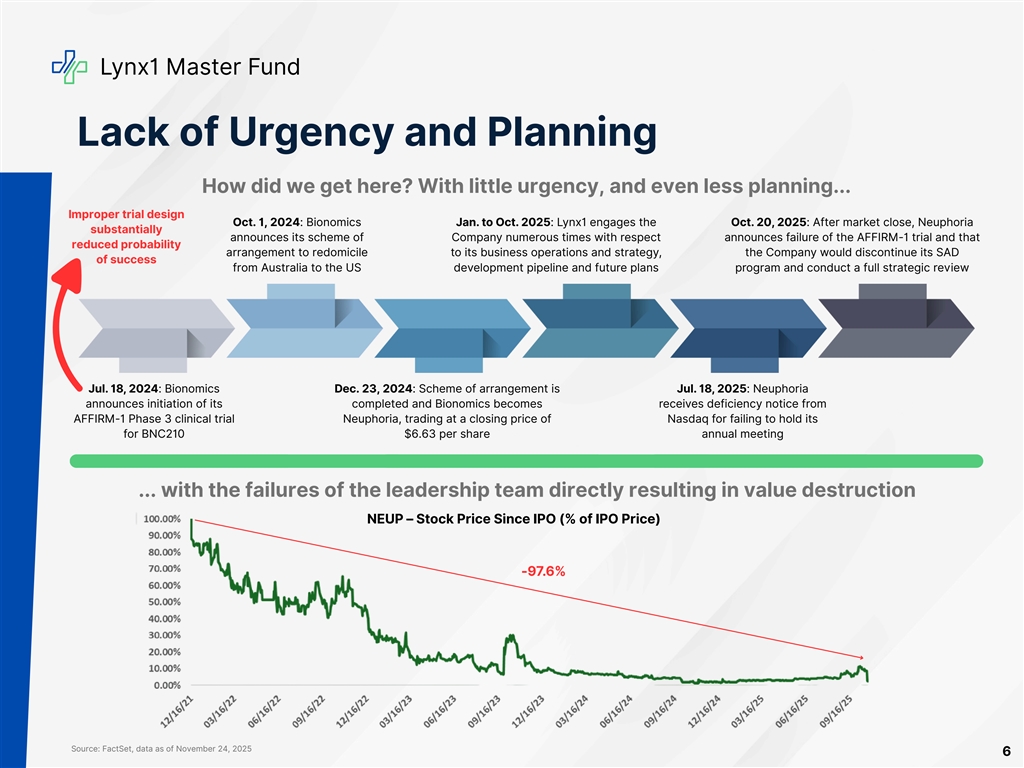 Lynx1 Master Fund About Neuphoria Therapeutics Company Overview Neuphoria is a clinical-stage biotech company developing impactful treatments for neuropsychiatric disorders. Its lead drug candidate, BNC210, is a first-of-its-kind drug designed to restore neurotransmitter balance in key brain areas. The Company has a strategic partnership with Merck for the treatment of cognitive deficits in Alzheimer’s disease and other central nervous system conditions, with the potential to generate up to hundreds of millions in milestones and royalties Value Creation Opportunity The Company is positioned at a pivotal moment in its evolution, with a robust strategic alternatives process offering the opportunity for value-maximizing transactional outcomes, delivering strong returns to all shareholders Unlocking the full value of the Company’s assets and potential strategic alternatives requires the right leadership and oversight Neuphoria’s problem is not its science, but its execution—we are calling for action now to implement the changes required to move the Company forward 5
