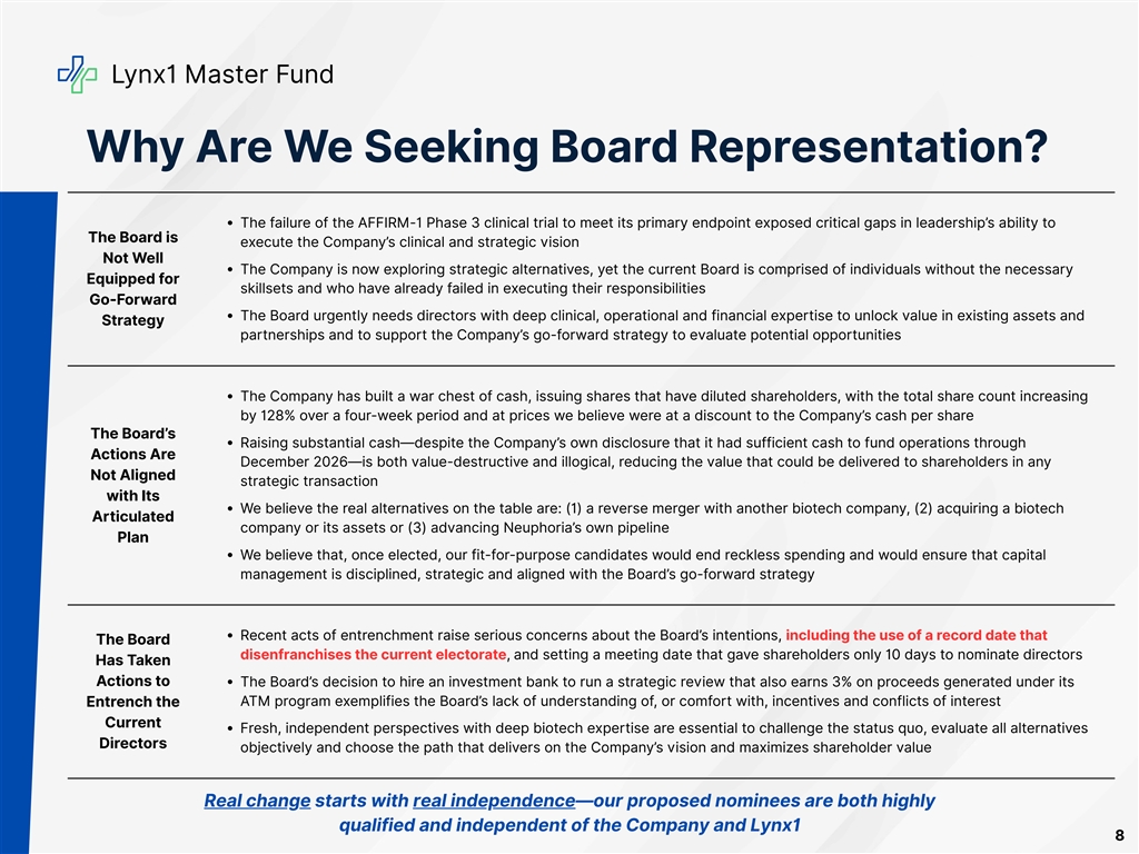 Lynx1 Master Fund Neuphoria’s Leadership is Unprepared, Untransparent and Unaccountable Underprepared Lack of Aimless Leadership Transparency Dilution Despite previously stating that it had We believe that current leadership was In the wake of the failure of the sufficient cash to fund operations not prepared for the failure of the AFFIRM-1 trial, management failed to through December 2026, the Company AFFIRM-1 Phase 3 clinical trial of provide basic transparency regarding undertook a share-issuance spree BNC210, despite the well-known risks of the Company’s financial runway and through its ATM program, raising cash central nervous system (CNS) trials capital requirements with no stated objective and diluting shareholders at prices we believe were below the Company’s cash per share We believe these actions demonstrate a systemic failure of execution and oversight, leaving shareholders exposed and the stock price eroded Illustrative Example of Dilution Pre-Dilution Post-Dilution (October 15, 2025) (November 14, 2025) (assuming Oct. 15 record date) Percentage of Your Shares Remaining Outstanding Shares Able to Vote at the Annual Meeting Newly Outstanding Shares NOT Able 128% increase in shares to Vote at the Annual Meeting 7