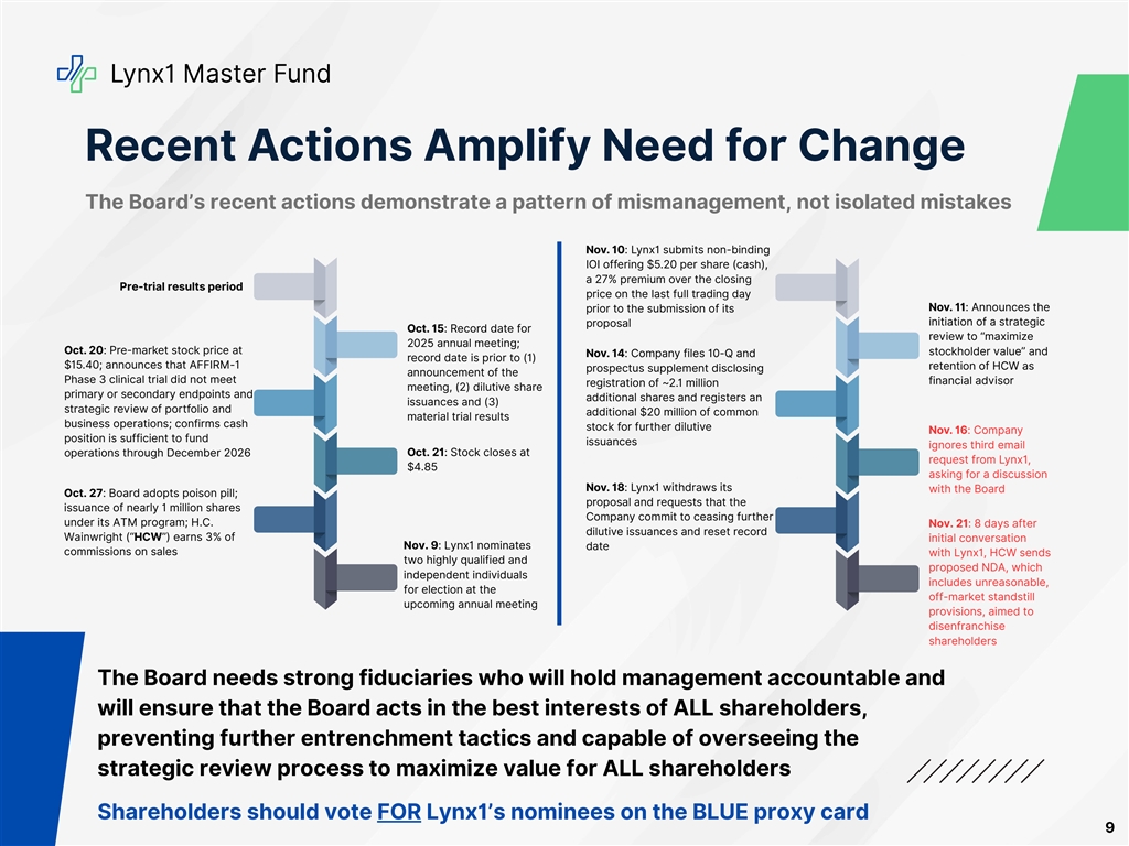 Lynx1 Master Fund Why Are We Seeking Board Representation? The failure of the AFFIRM-1 Phase 3 clinical trial to meet its primary endpoint exposed critical gaps in leadership’s ability to The Board is execute the Company’s clinical and strategic vision Not Well The Company is now exploring strategic alternatives, yet the current Board is comprised of individuals without the necessary Equipped for skillsets and who have already failed in executing their responsibilities Go-Forward The Board urgently needs directors with deep clinical, operational and financial expertise to unlock value in existing assets and Strategy partnerships and to support the Company’s go-forward strategy to evaluate potential opportunities The Company has built a war chest of cash, issuing shares that have diluted shareholders, with the total share count increasing by 128% over a four-week period and at prices we believe were at a discount to the Company’s cash per share The Board’s Raising substantial cash—despite the Company’s own disclosure that it had sufficient cash to fund operations through Actions Are December 2026—is both value-destructive and illogical, reducing the value that could be delivered to shareholders in any Not Aligned strategic transaction with Its We believe the real alternatives on the table are: (1) a reverse merger with another biotech company, (2) acquiring a biotech Articulated company or its assets or (3) advancing Neuphoria’s own pipeline Plan We believe that, once elected, our fit-for-purpose candidates would end reckless spending and would ensure that capital management is disciplined, strategic and aligned with the Board’s go-forward strategy Recent acts of entrenchment raise serious concerns about the Board’s intentions, including the use of a record date that The Board disenfranchises the current electorate, and setting a meeting date that gave shareholders only 10 days to nominate directors Has Taken Actions to The Board’s decision to hire an investment bank to run a strategic review that also earns 3% on proceeds generated under its ATM program exemplifies the Board’s lack of understanding of, or comfort with, incentives and conflicts of interest Entrench the Current Fresh, independent perspectives with deep biotech expertise are essential to challenge the status quo, evaluate all alternatives Directors objectively and choose the path that delivers on the Company’s vision and maximizes shareholder value Real change starts with real independence—our proposed nominees are both highly qualified and independent of the Company and Lynx1 8