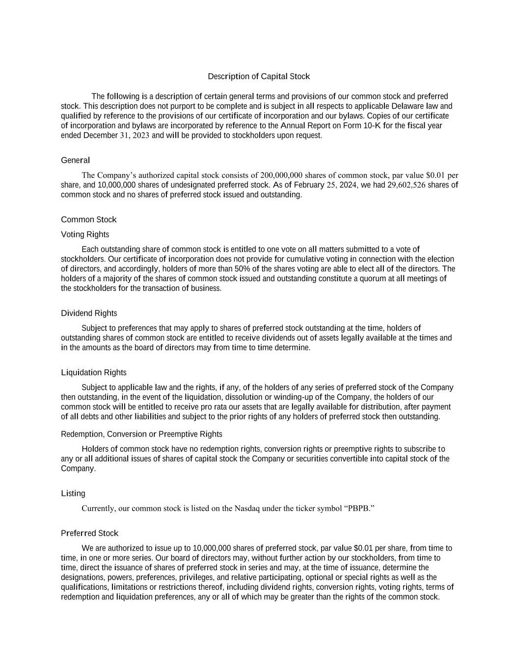 Description of Capital Stock The following is a description of certain general terms and provisions of our common stock and preferred stock. This description does not purport to be complete and is subject in all respects to applicable Delaware law and qualified by reference to the provisions of our certificate of incorporation and our bylaws. Copies of our certificate of incorporation and bylaws are incorporated by reference to the Annual Report on Form 10-K for the fiscal year ended December 31, 2023 and will be provided to stockholders upon request. General The Company’s authorized capital stock consists of 200,000,000 shares of common stock, par value $0.01 per share, and 10,000,000 shares of undesignated preferred stock. As of February 25, 2024, we had 29,602,526 shares of common stock and no shares of preferred stock issued and outstanding. Common Stock Voting Rights Each outstanding share of common stock is entitled to one vote on all matters submitted to a vote of stockholders. Our certificate of incorporation does not provide for cumulative voting in connection with the election of directors, and accordingly, holders of more than 50% of the shares voting are able to elect all of the directors. The holders of a majority of the shares of common stock issued and outstanding constitute a quorum at all meetings of the stockholders for the transaction of business. Dividend Rights Subject to preferences that may apply to shares of preferred stock outstanding at the time, holders of outstanding shares of common stock are entitled to receive dividends out of assets legally available at the times and in the amounts as the board of directors may from time to time determine. Liquidation Rights Subject to applicable law and the rights, if any, of the holders of any series of preferred stock of the Company then outstanding, in the event of the liquidation, dissolution or winding-up of the Company, the holders of our common stock will be entitled to receive pro rata our assets that are legally available for distribution, after payment of all debts and other liabilities and subject to the prior rights of any holders of preferred stock then outstanding. Redemption, Conversion or Preemptive Rights Holders of common stock have no redemption rights, conversion rights or preemptive rights to subscribe to any or all additional issues of shares of capital stock the Company or securities convertible into capital stock of the Company. Listing Currently, our common stock is listed on the Nasdaq under the ticker symbol “PBPB.” Preferred Stock We are authorized to issue up to 10,000,000 shares of preferred stock, par value $0.01 per share, from time to time, in one or more series. Our board of directors may, without further action by our stockholders, from time to time, direct the issuance of shares of preferred stock in series and may, at the time of issuance, determine the designations, powers, preferences, privileges, and relative participating, optional or special rights as well as the qualifications, limitations or restrictions thereof, including dividend rights, conversion rights, voting rights, terms of redemption and liquidation preferences, any or all of which may be greater than the rights of the common stock.