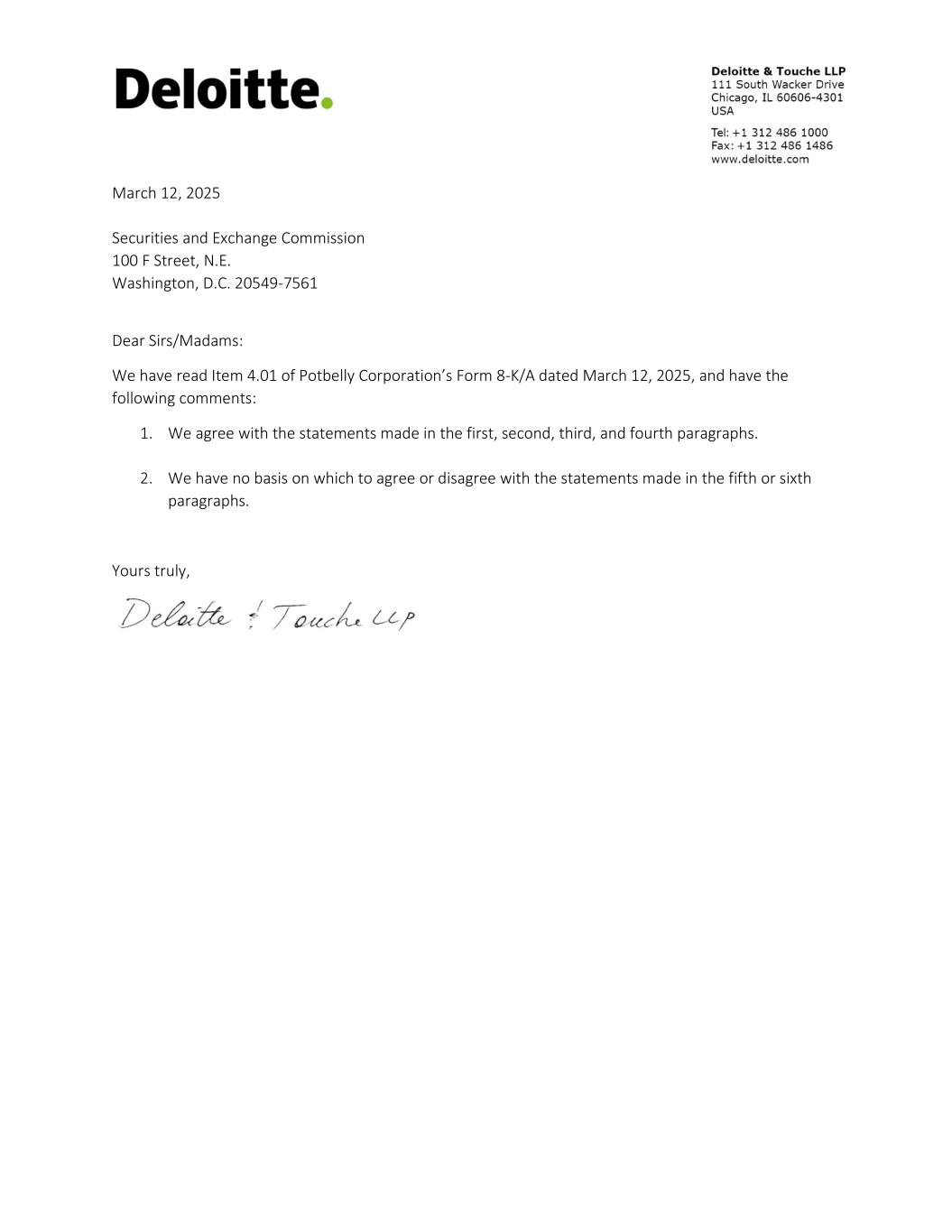 March 12, 2025 Securities and Exchange Commission 100 F Street, N.E. Washington, D.C. 20549-7561 Dear Sirs/Madams: We have read Item 4.01 of Potbelly Corporation’s Form 8-K/A dated March 12, 2025, and have the following comments: 1. We agree with the statements made in the first, second, third, and fourth paragraphs. 2. We have no basis on which to agree or disagree with the statements made in the fifth or sixth paragraphs. Yours truly,