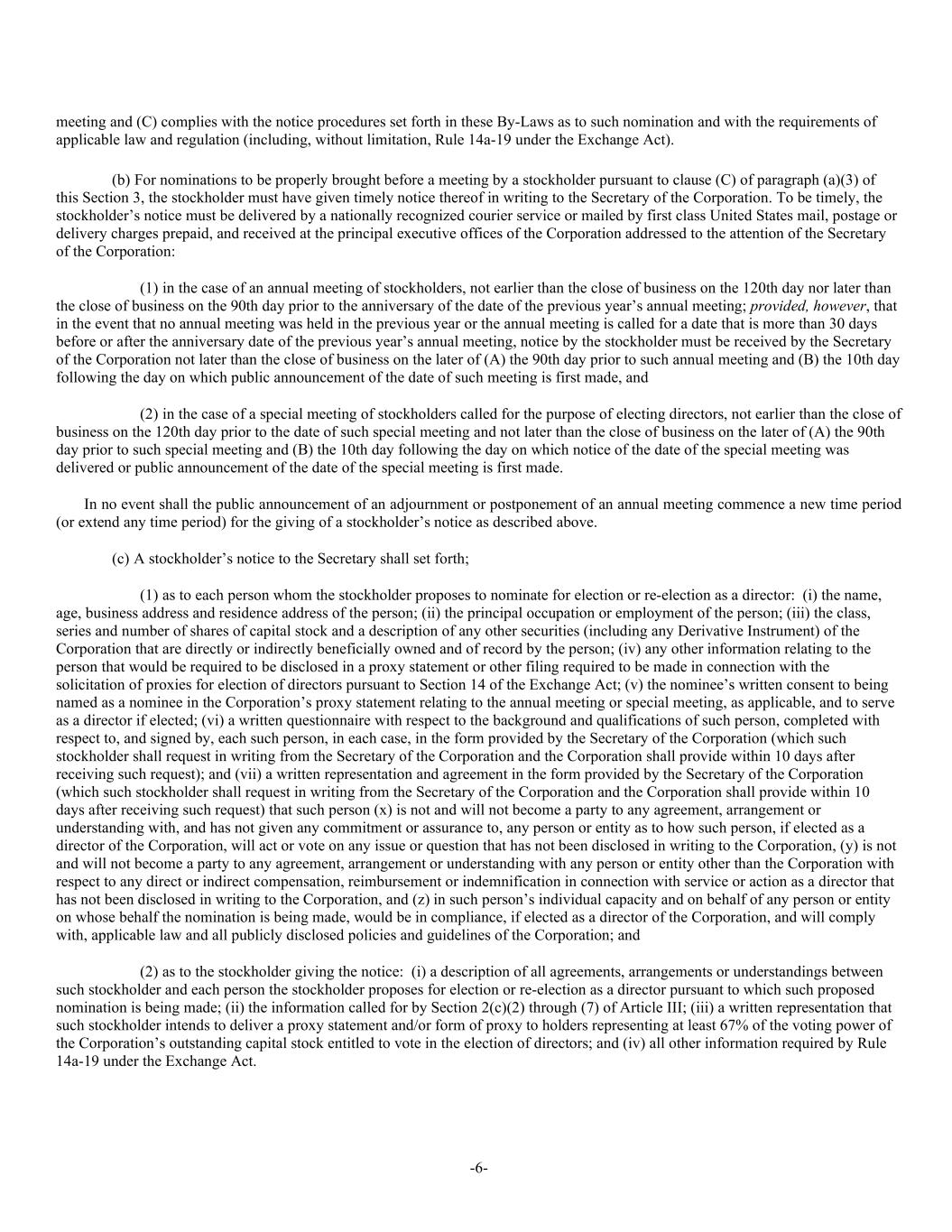 -6- meeting and (C) complies with the notice procedures set forth in these By-Laws as to such nomination and with the requirements of applicable law and regulation (including, without limitation, Rule 14a-19 under the Exchange Act). (b) For nominations to be properly brought before a meeting by a stockholder pursuant to clause (C) of paragraph (a)(3) of this Section 3, the stockholder must have given timely notice thereof in writing to the Secretary of the Corporation. To be timely, the stockholder’s notice must be delivered by a nationally recognized courier service or mailed by first class United States mail, postage or delivery charges prepaid, and received at the principal executive offices of the Corporation addressed to the attention of the Secretary of the Corporation: (1) in the case of an annual meeting of stockholders, not earlier than the close of business on the 120th day nor later than the close of business on the 90th day prior to the anniversary of the date of the previous year’s annual meeting; provided, however, that in the event that no annual meeting was held in the previous year or the annual meeting is called for a date that is more than 30 days before or after the anniversary date of the previous year’s annual meeting, notice by the stockholder must be received by the Secretary of the Corporation not later than the close of business on the later of (A) the 90th day prior to such annual meeting and (B) the 10th day following the day on which public announcement of the date of such meeting is first made, and (2) in the case of a special meeting of stockholders called for the purpose of electing directors, not earlier than the close of business on the 120th day prior to the date of such special meeting and not later than the close of business on the later of (A) the 90th day prior to such special meeting and (B) the 10th day following the day on which notice of the date of the special meeting was delivered or public announcement of the date of the special meeting is first made. In no event shall the public announcement of an adjournment or postponement of an annual meeting commence a new time period (or extend any time period) for the giving of a stockholder’s notice as described above. (c) A stockholder’s notice to the Secretary shall set forth; (1) as to each person whom the stockholder proposes to nominate for election or re-election as a director: (i) the name, age, business address and residence address of the person; (ii) the principal occupation or employment of the person; (iii) the class, series and number of shares of capital stock and a description of any other securities (including any Derivative Instrument) of the Corporation that are directly or indirectly beneficially owned and of record by the person; (iv) any other information relating to the person that would be required to be disclosed in a proxy statement or other filing required to be made in connection with the solicitation of proxies for election of directors pursuant to Section 14 of the Exchange Act; (v) the nominee’s written consent to being named as a nominee in the Corporation’s proxy statement relating to the annual meeting or special meeting, as applicable, and to serve as a director if elected; (vi) a written questionnaire with respect to the background and qualifications of such person, completed with respect to, and signed by, each such person, in each case, in the form provided by the Secretary of the Corporation (which such stockholder shall request in writing from the Secretary of the Corporation and the Corporation shall provide within 10 days after receiving such request); and (vii) a written representation and agreement in the form provided by the Secretary of the Corporation (which such stockholder shall request in writing from the Secretary of the Corporation and the Corporation shall provide within 10 days after receiving such request) that such person (x) is not and will not become a party to any agreement, arrangement or understanding with, and has not given any commitment or assurance to, any person or entity as to how such person, if elected as a director of the Corporation, will act or vote on any issue or question that has not been disclosed in writing to the Corporation, (y) is not and will not become a party to any agreement, arrangement or understanding with any person or entity other than the Corporation with respect to any direct or indirect compensation, reimbursement or indemnification in connection with service or action as a director that has not been disclosed in writing to the Corporation, and (z) in such person’s individual capacity and on behalf of any person or entity on whose behalf the nomination is being made, would be in compliance, if elected as a director of the Corporation, and will comply with, applicable law and all publicly disclosed policies and guidelines of the Corporation; and (2) as to the stockholder giving the notice: (i) a description of all agreements, arrangements or understandings between such stockholder and each person the stockholder proposes for election or re-election as a director pursuant to which such proposed nomination is being made; (ii) the information called for by Section 2(c)(2) through (7) of Article III; (iii) a written representation that such stockholder intends to deliver a proxy statement and/or form of proxy to holders representing at least 67% of the voting power of the Corporation’s outstanding capital stock entitled to vote in the election of directors; and (iv) all other information required by Rule 14a-19 under the Exchange Act.