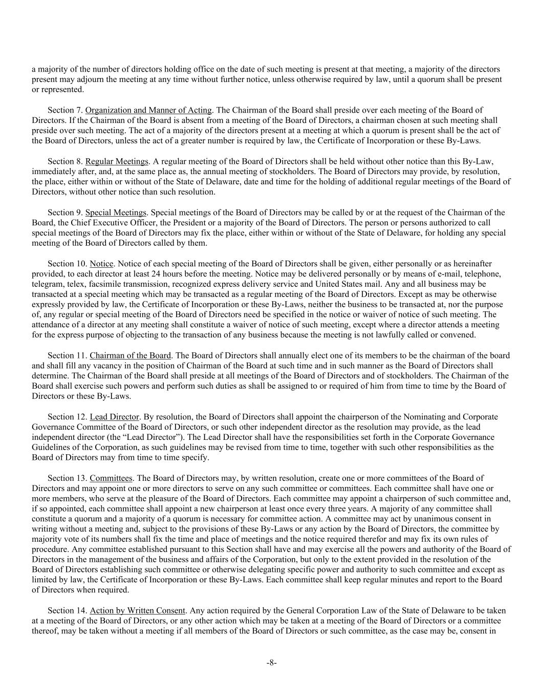 -8- a majority of the number of directors holding office on the date of such meeting is present at that meeting, a majority of the directors present may adjourn the meeting at any time without further notice, unless otherwise required by law, until a quorum shall be present or represented. Section 7. Organization and Manner of Acting. The Chairman of the Board shall preside over each meeting of the Board of Directors. If the Chairman of the Board is absent from a meeting of the Board of Directors, a chairman chosen at such meeting shall preside over such meeting. The act of a majority of the directors present at a meeting at which a quorum is present shall be the act of the Board of Directors, unless the act of a greater number is required by law, the Certificate of Incorporation or these By-Laws. Section 8. Regular Meetings. A regular meeting of the Board of Directors shall be held without other notice than this By-Law, immediately after, and, at the same place as, the annual meeting of stockholders. The Board of Directors may provide, by resolution, the place, either within or without of the State of Delaware, date and time for the holding of additional regular meetings of the Board of Directors, without other notice than such resolution. Section 9. Special Meetings. Special meetings of the Board of Directors may be called by or at the request of the Chairman of the Board, the Chief Executive Officer, the President or a majority of the Board of Directors. The person or persons authorized to call special meetings of the Board of Directors may fix the place, either within or without of the State of Delaware, for holding any special meeting of the Board of Directors called by them. Section 10. Notice. Notice of each special meeting of the Board of Directors shall be given, either personally or as hereinafter provided, to each director at least 24 hours before the meeting. Notice may be delivered personally or by means of e-mail, telephone, telegram, telex, facsimile transmission, recognized express delivery service and United States mail. Any and all business may be transacted at a special meeting which may be transacted as a regular meeting of the Board of Directors. Except as may be otherwise expressly provided by law, the Certificate of Incorporation or these By-Laws, neither the business to be transacted at, nor the purpose of, any regular or special meeting of the Board of Directors need be specified in the notice or waiver of notice of such meeting. The attendance of a director at any meeting shall constitute a waiver of notice of such meeting, except where a director attends a meeting for the express purpose of objecting to the transaction of any business because the meeting is not lawfully called or convened. Section 11. Chairman of the Board. The Board of Directors shall annually elect one of its members to be the chairman of the board and shall fill any vacancy in the position of Chairman of the Board at such time and in such manner as the Board of Directors shall determine. The Chairman of the Board shall preside at all meetings of the Board of Directors and of stockholders. The Chairman of the Board shall exercise such powers and perform such duties as shall be assigned to or required of him from time to time by the Board of Directors or these By-Laws. Section 12. Lead Director. By resolution, the Board of Directors shall appoint the chairperson of the Nominating and Corporate Governance Committee of the Board of Directors, or such other independent director as the resolution may provide, as the lead independent director (the “Lead Director”). The Lead Director shall have the responsibilities set forth in the Corporate Governance Guidelines of the Corporation, as such guidelines may be revised from time to time, together with such other responsibilities as the Board of Directors may from time to time specify. Section 13. Committees. The Board of Directors may, by written resolution, create one or more committees of the Board of Directors and may appoint one or more directors to serve on any such committee or committees. Each committee shall have one or more members, who serve at the pleasure of the Board of Directors. Each committee may appoint a chairperson of such committee and, if so appointed, each committee shall appoint a new chairperson at least once every three years. A majority of any committee shall constitute a quorum and a majority of a quorum is necessary for committee action. A committee may act by unanimous consent in writing without a meeting and, subject to the provisions of these By-Laws or any action by the Board of Directors, the committee by majority vote of its numbers shall fix the time and place of meetings and the notice required therefor and may fix its own rules of procedure. Any committee established pursuant to this Section shall have and may exercise all the powers and authority of the Board of Directors in the management of the business and affairs of the Corporation, but only to the extent provided in the resolution of the Board of Directors establishing such committee or otherwise delegating specific power and authority to such committee and except as limited by law, the Certificate of Incorporation or these By-Laws. Each committee shall keep regular minutes and report to the Board of Directors when required. Section 14. Action by Written Consent. Any action required by the General Corporation Law of the State of Delaware to be taken at a meeting of the Board of Directors, or any other action which may be taken at a meeting of the Board of Directors or a committee thereof, may be taken without a meeting if all members of the Board of Directors or such committee, as the case may be, consent in