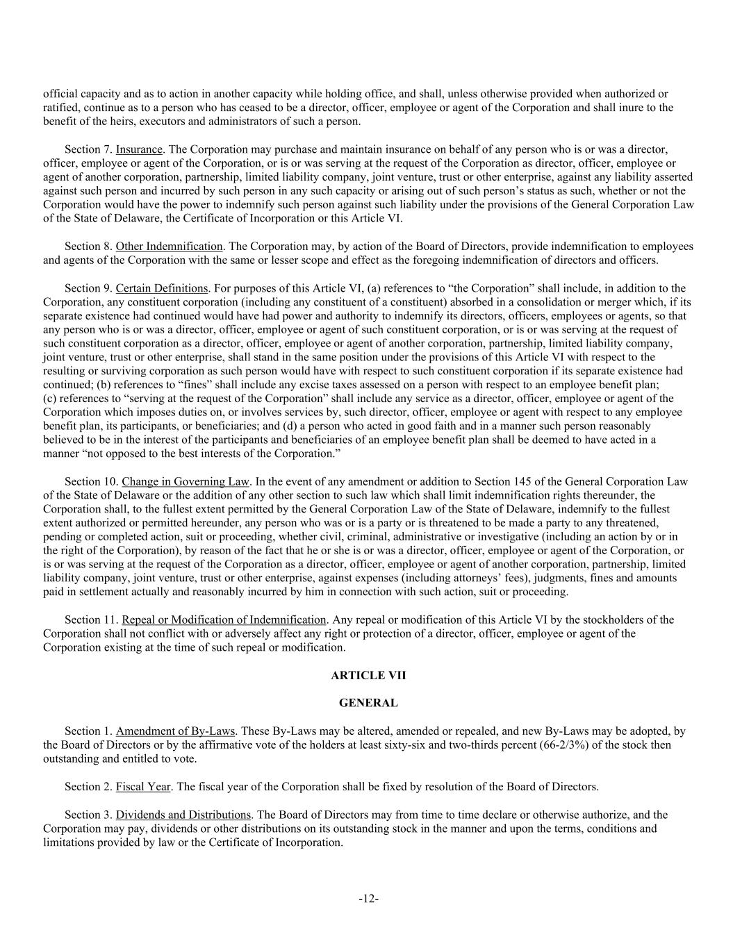 -12- official capacity and as to action in another capacity while holding office, and shall, unless otherwise provided when authorized or ratified, continue as to a person who has ceased to be a director, officer, employee or agent of the Corporation and shall inure to the benefit of the heirs, executors and administrators of such a person. Section 7. Insurance. The Corporation may purchase and maintain insurance on behalf of any person who is or was a director, officer, employee or agent of the Corporation, or is or was serving at the request of the Corporation as director, officer, employee or agent of another corporation, partnership, limited liability company, joint venture, trust or other enterprise, against any liability asserted against such person and incurred by such person in any such capacity or arising out of such person’s status as such, whether or not the Corporation would have the power to indemnify such person against such liability under the provisions of the General Corporation Law of the State of Delaware, the Certificate of Incorporation or this Article VI. Section 8. Other Indemnification. The Corporation may, by action of the Board of Directors, provide indemnification to employees and agents of the Corporation with the same or lesser scope and effect as the foregoing indemnification of directors and officers. Section 9. Certain Definitions. For purposes of this Article VI, (a) references to “the Corporation” shall include, in addition to the Corporation, any constituent corporation (including any constituent of a constituent) absorbed in a consolidation or merger which, if its separate existence had continued would have had power and authority to indemnify its directors, officers, employees or agents, so that any person who is or was a director, officer, employee or agent of such constituent corporation, or is or was serving at the request of such constituent corporation as a director, officer, employee or agent of another corporation, partnership, limited liability company, joint venture, trust or other enterprise, shall stand in the same position under the provisions of this Article VI with respect to the resulting or surviving corporation as such person would have with respect to such constituent corporation if its separate existence had continued; (b) references to “fines” shall include any excise taxes assessed on a person with respect to an employee benefit plan; (c) references to “serving at the request of the Corporation” shall include any service as a director, officer, employee or agent of the Corporation which imposes duties on, or involves services by, such director, officer, employee or agent with respect to any employee benefit plan, its participants, or beneficiaries; and (d) a person who acted in good faith and in a manner such person reasonably believed to be in the interest of the participants and beneficiaries of an employee benefit plan shall be deemed to have acted in a manner “not opposed to the best interests of the Corporation.” Section 10. Change in Governing Law. In the event of any amendment or addition to Section 145 of the General Corporation Law of the State of Delaware or the addition of any other section to such law which shall limit indemnification rights thereunder, the Corporation shall, to the fullest extent permitted by the General Corporation Law of the State of Delaware, indemnify to the fullest extent authorized or permitted hereunder, any person who was or is a party or is threatened to be made a party to any threatened, pending or completed action, suit or proceeding, whether civil, criminal, administrative or investigative (including an action by or in the right of the Corporation), by reason of the fact that he or she is or was a director, officer, employee or agent of the Corporation, or is or was serving at the request of the Corporation as a director, officer, employee or agent of another corporation, partnership, limited liability company, joint venture, trust or other enterprise, against expenses (including attorneys’ fees), judgments, fines and amounts paid in settlement actually and reasonably incurred by him in connection with such action, suit or proceeding. Section 11. Repeal or Modification of Indemnification. Any repeal or modification of this Article VI by the stockholders of the Corporation shall not conflict with or adversely affect any right or protection of a director, officer, employee or agent of the Corporation existing at the time of such repeal or modification. ARTICLE VII GENERAL Section 1. Amendment of By-Laws. These By-Laws may be altered, amended or repealed, and new By-Laws may be adopted, by the Board of Directors or by the affirmative vote of the holders at least sixty-six and two-thirds percent (66-2/3%) of the stock then outstanding and entitled to vote. Section 2. Fiscal Year. The fiscal year of the Corporation shall be fixed by resolution of the Board of Directors. Section 3. Dividends and Distributions. The Board of Directors may from time to time declare or otherwise authorize, and the Corporation may pay, dividends or other distributions on its outstanding stock in the manner and upon the terms, conditions and limitations provided by law or the Certificate of Incorporation.