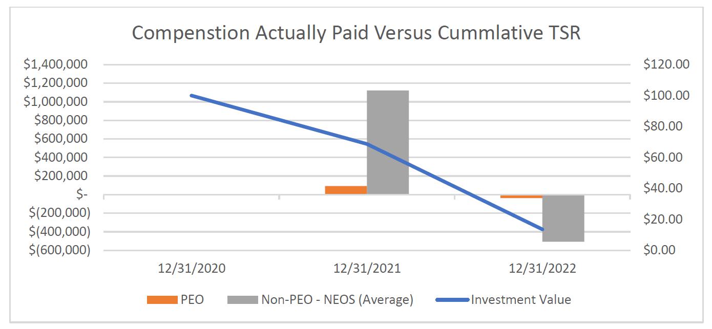 The following graph sets forth the relationship between Compensation Actually Paid to our PEO, the average of Compensation Actually Paid to our Non-PEO NEOs, and the Company’s TSR over the period covering fiscal years 2021 and 2022. As demonstrated by the graph below, the amount of Compensation Actually Paid to Mr. Astor, and the average amount of Compensation Actually paid to the company’s other NEOs as a group (i.e., Mr. Lobo), is aligned with the Company’s TSR for the years presented. The alignment of Compensation Actually Paid with the Company’s cumulative TSR over the period presented is a result of having a significant portion of executive compensation tied to equity awards, the fair value of which is inherently driven by the Company’s stock price. During 2022, we did not award any equity or non-equity incentives to our named executive officers.