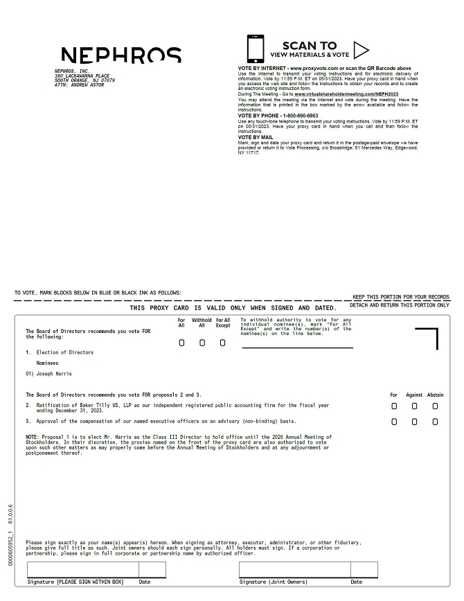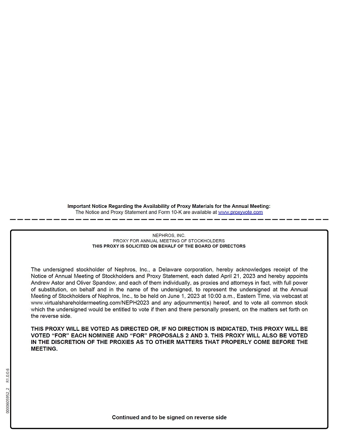 The Board of Directors of Nephros, Inc. (the “Company,” “we,” “us” or “our”) is soliciting your proxy to vote at the Annual Meeting of Stockholders (the “Annual Meeting”) to be held virtually and live via webcast on Thursday, June 1, 2023 at 10:00 a.m., Eastern Time, including at any adjournments or postponements of the virtual Annual Meeting. You are invited to attend the virtual Annual Meeting to vote on the proposals described in this proxy statement by joining the webcast available at virtualshareholdermeeting.com/NEPH2023. You do not need to attend the virtual Annual Meeting to vote your shares. Instead, you may simply complete, sign and return the enclosed proxy card or voting instruction form, if you received paper copies of the proxy materials, or follow the instructions below to submit your proxy over the telephone or the Internet.