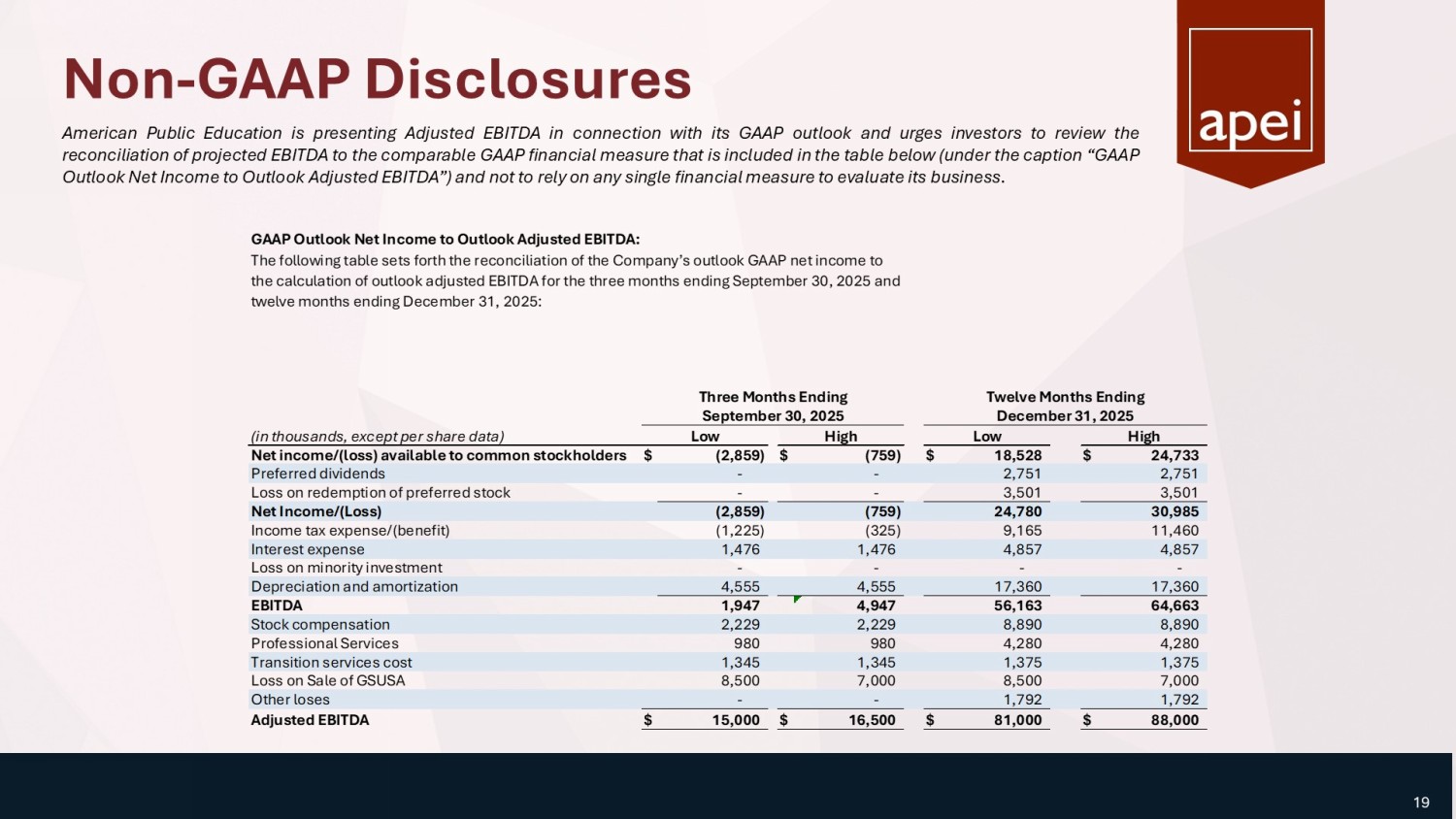 Non - GAAP Disclosures GAAP Net Income to Adjusted EBITDA: The following table sets forth the reconciliation of the Company’s reported GAAP net income to the calculation of adjusted EBITDA for the three and six months ended June 30, 2025 and 2024: (in thousands, except per share data) Net (loss) income available to common stockholders $ (324) $ (1,160) $ 7,137 $ (2,179) Preferred dividends 1,319 1,531 2,751 3,066 Loss on redemption of preferred stock 3,501 - 3,501 - Net income $ 4,496 $ 371 $ 13,389 $ 887 Income tax expense 1,421 (16) 3,887 1,197 Interest expense, net 1,108 785 1,995 911 Equity investment loss - 1,080 - 4,407 Depreciation and amortization 4,088 5,232 8,080 10,360 EBITDA 11,113 7,452 27,351 17,762 Loss on assets held for sale - - 1,527 - Loss on leases - 779 - 3,715 Other professional fees 1,715 - 2,704 - Stock compensation 2,238 1,823 4,501 3,741 Loss on disposals of long-lived assets 35 184 265 212 Transition services costs - 182 - 2,047 Severance - 505 - 505 Adjusted EBITDA $ 15,101 $ 10,925 $ 36,348 $ 27,982 Three Months Ended June 30, 2025 2024 Six Months Ended June 30, 2025 2024 18 American Public Education is presenting adjusted EBITDA and urges investors to review the reconciliation of net income to the comparable GAAP financial measure that is included in the table below (under the caption “GAAP Net Income to Adjusted EBITDA”) and not to rely on any single financial measure to evaluate its business .