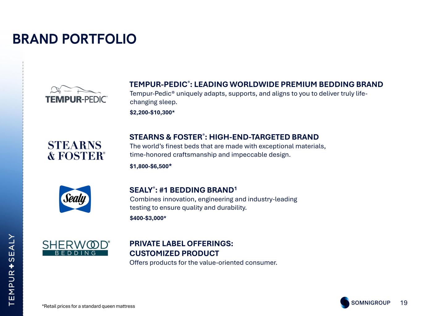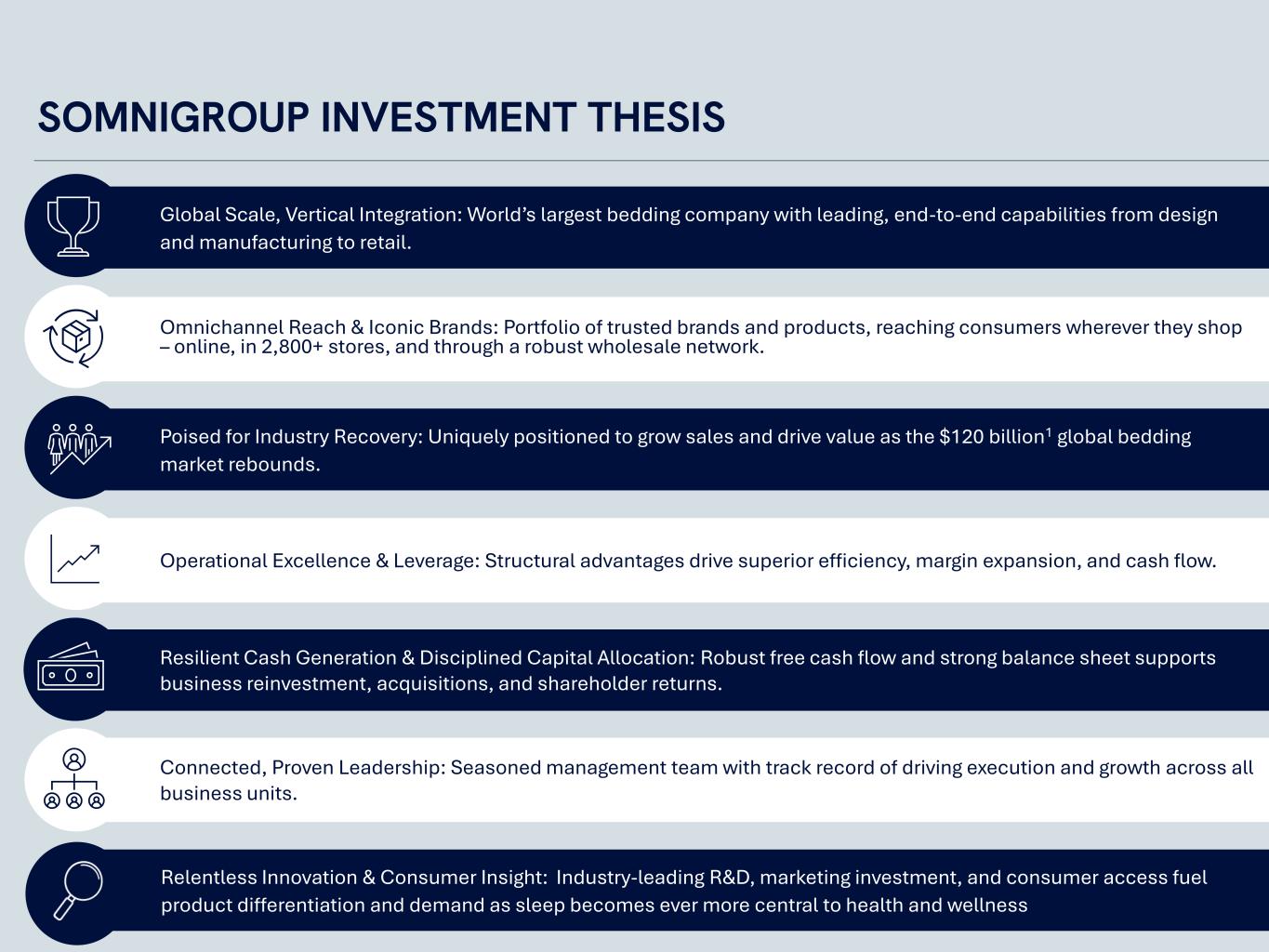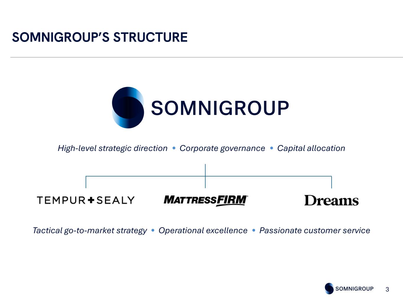 Global Scale, Vertical Integration: World’s largest bedding company with leading, end-to-end capabilities from design and manufacturing to retail. Omnichannel Reach & Iconic Brands: Portfolio of trusted brands and products, reaching consumers wherever they shop – online, in 2,800+ stores, and through a robust wholesale network. Poised for Industry Recovery: Uniquely positioned to grow sales and drive value as the $120 billion1 global bedding market rebounds. Operational Excellence & Leverage: Structural advantages drive superior efficiency, margin expansion, and cash flow. Resilient Cash Generation & Disciplined Capital Allocation: Robust free cash flow and strong balance sheet supports business reinvestment, acquisitions, and shareholder returns. Connected, Proven Leadership: Seasoned management team with track record of driving execution and growth across all business units. SOMNIGROUP INVESTMENT THESIS 2 Relentless Innovation & Consumer Insight: Industry-leading R&D, marketing investment, and consumer access fuel product differentiation and demand as sleep becomes ever more central to health and wellness