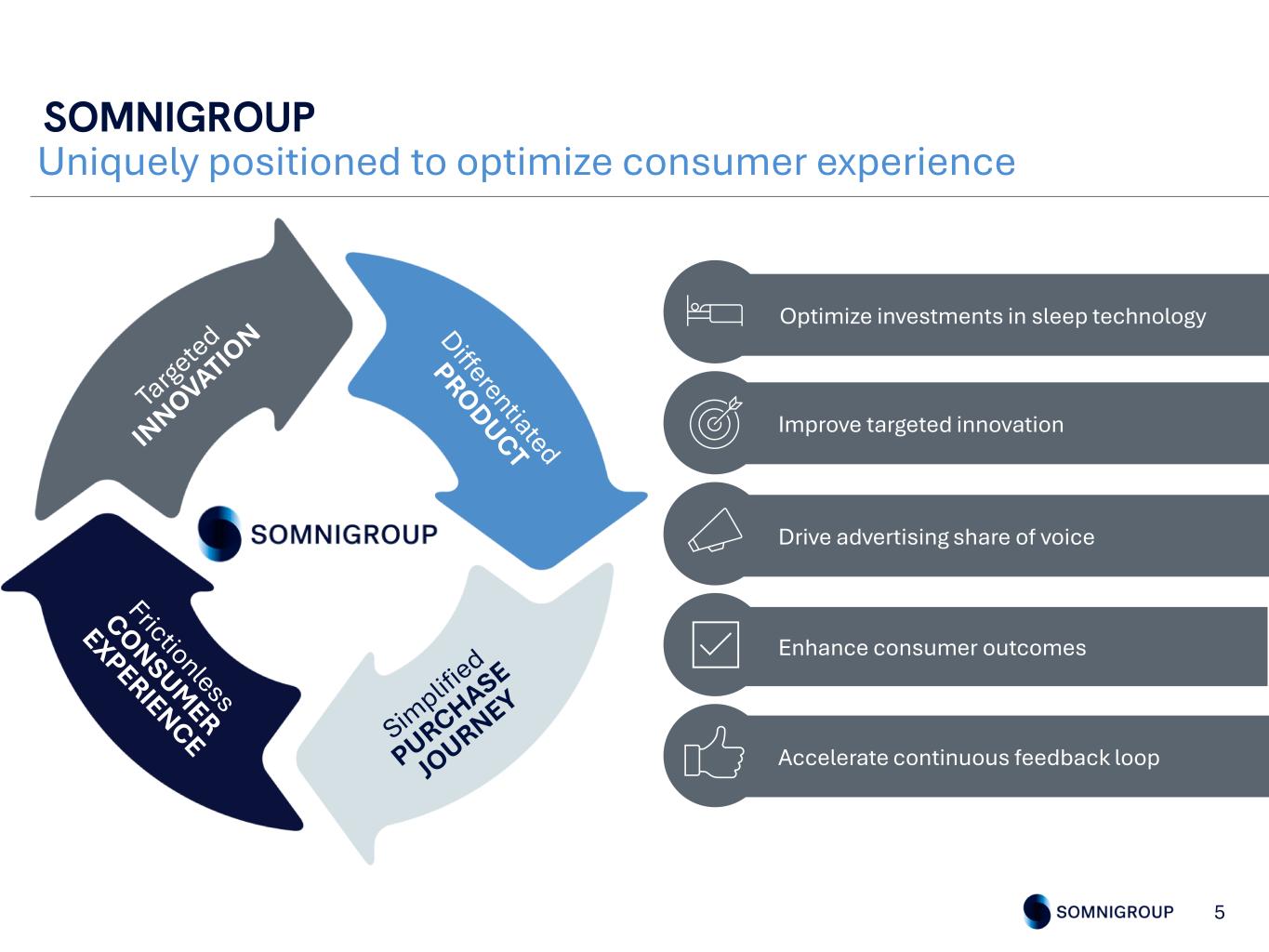 SOMNIGROUP 4 CONSUMER-CENTRIC INNOVATION DIVERSIFIED PORTFOLIO MANUFACTURING & LOGISTICS OMNI-CHANNEL RETAIL • Advanced R&D capabilities driving continuous solutions-based innovation • Diverse brand portfolio includes the most highly recognized brands in the industry • Global manufacturing footprint with advanced manufacturing and logistics capabilities • Leading bedding retailer in the U.S. and UK • Integrated brick- and-mortar and e-commerce ecosystem The world’s largest bedding company, dedicated to enriching people’s lives through the power of a great night’s sleep.