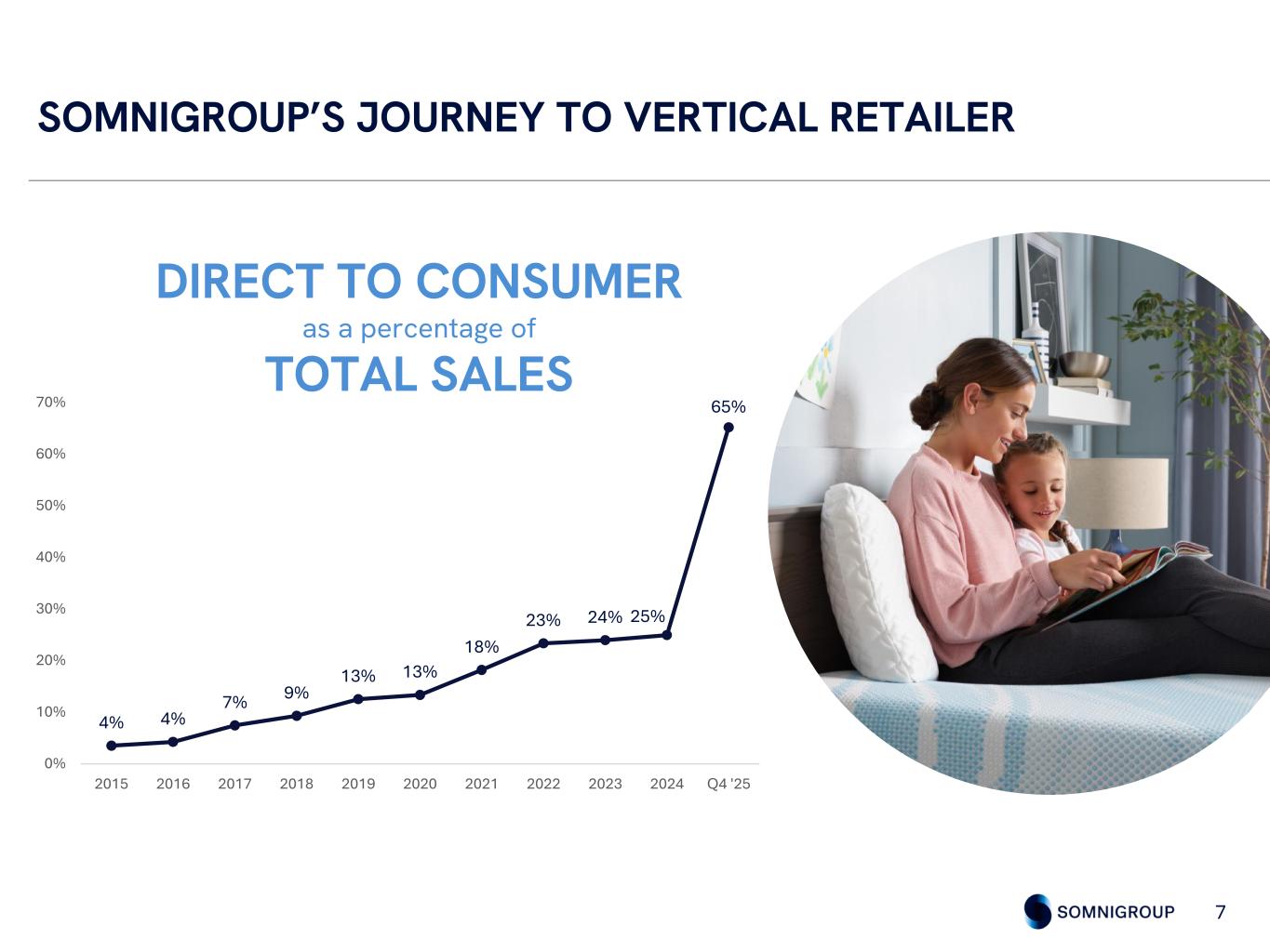 SOMNIGROUP’S VERTICALLY INTEGRATED STRATEGY 6 160+ OPERATIONS FACILITIES W I T H 2,800+ RETAIL STORES 20,000 associates Manufacturing and R&D facilities Distribution centers Logistics fleet Mattress Firm retail stores Dreams retail stores Tempur® retail stores E-commerce platforms SOMNIGROUP ECOSYSTEM