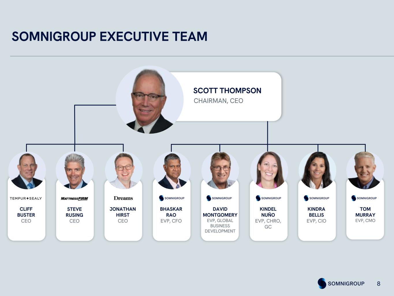 KINDRA BELLIS EVP, CIO DAVID MONTGOMERY EVP, GLOBAL BUSINESS DEVELOPMENT SOMNIGROUP EXECUTIVE TEAM 8 SCOTT THOMPSON CHAIRMAN, CEO CLIFF BUSTER CEO STEVE RUSING CEO JONATHAN HIRST CEO TOM MURRAY EVP, CMO KINDEL NUÑO EVP, CHRO, GC BHASKAR RAO EVP, CFO