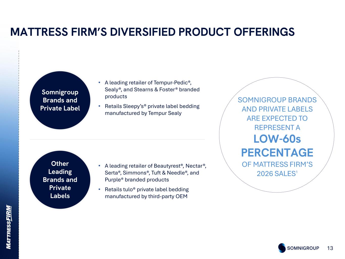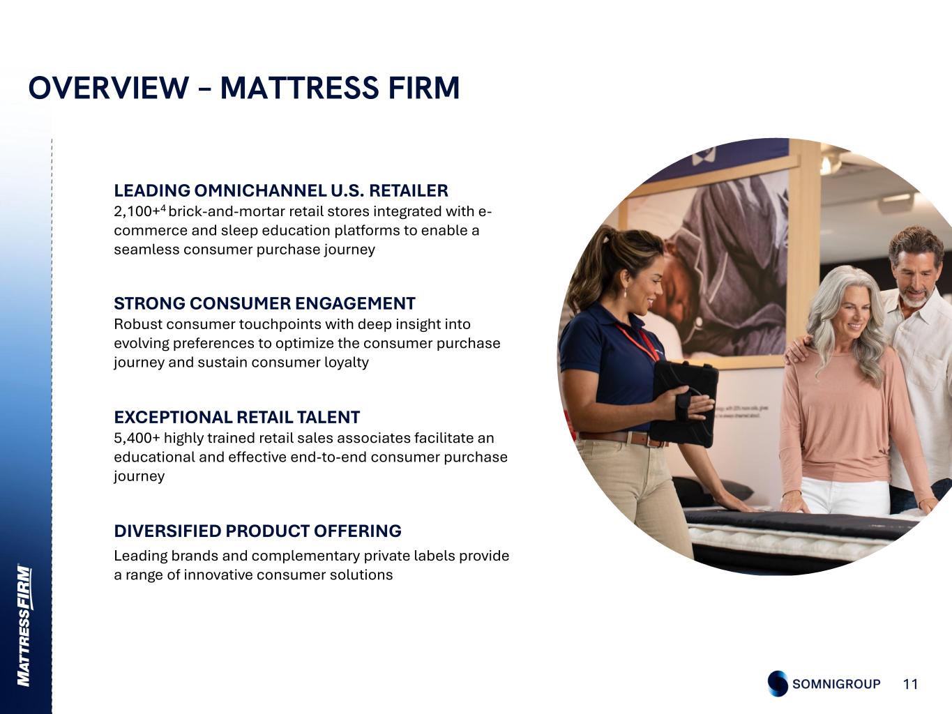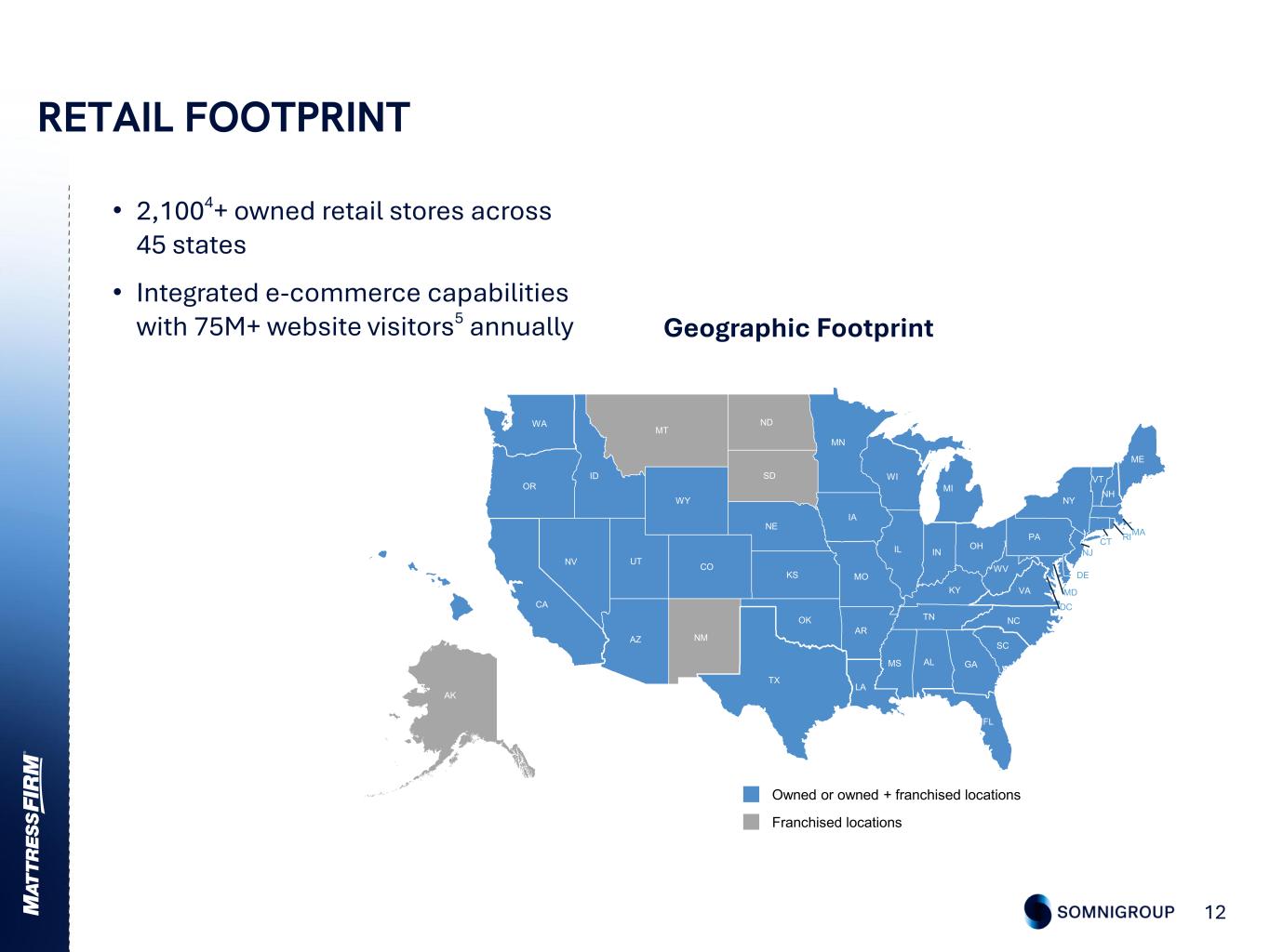 OVERVIEW – MATTRESS FIRM 11 LEADING OMNICHANNEL U.S. RETAILER 2,100+4 brick-and-mortar retail stores integrated with e- commerce and sleep education platforms to enable a seamless consumer purchase journey STRONG CONSUMER ENGAGEMENT Robust consumer touchpoints with deep insight into evolving preferences to optimize the consumer purchase journey and sustain consumer loyalty EXCEPTIONAL RETAIL TALENT 5,400+ highly trained retail sales associates facilitate an educational and effective end-to-end consumer purchase journey DIVERSIFIED PRODUCT OFFERING Leading brands and complementary private labels provide a range of innovative consumer solutions