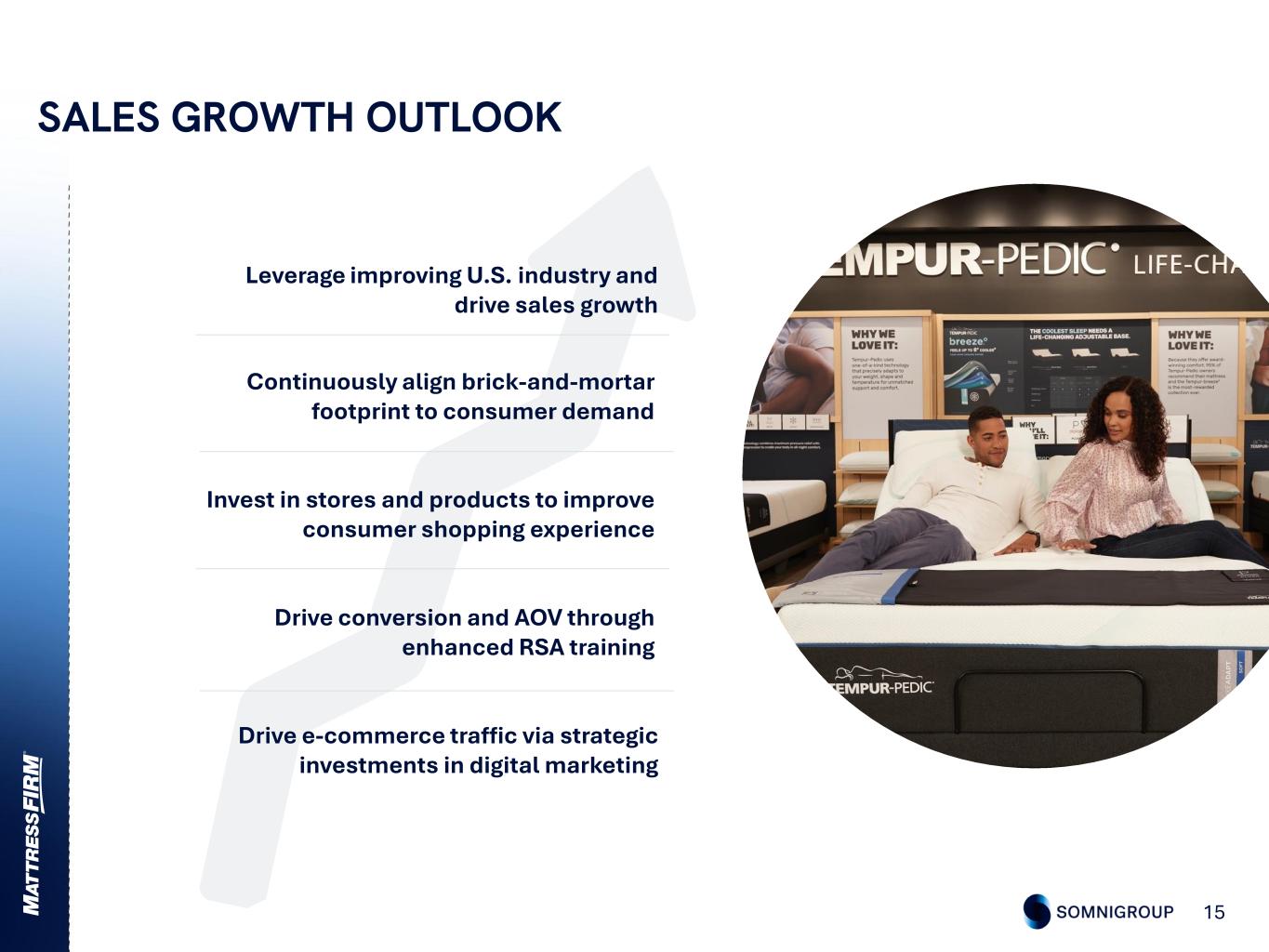 SCALE COMPETITIVE DIFFERENTIATORS 14 PRODUCT SELECTION Diverse and curated assortment CONVENIENCE Seamless experience nationwide on and offline RETAIL EXPERTISE Highly trained Sleep Experts EXPERIENCE Personalized to each consumer CONSUMER TOUCHPOINTS Data driven tools improving consumer outcomes LOGISTICS Accelerated order-to-deliver