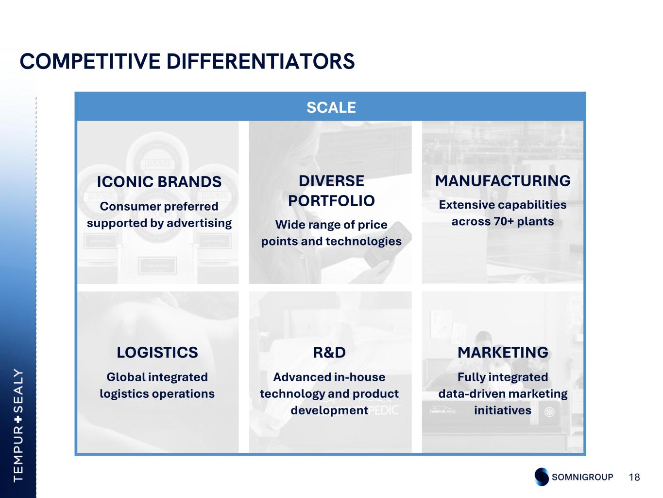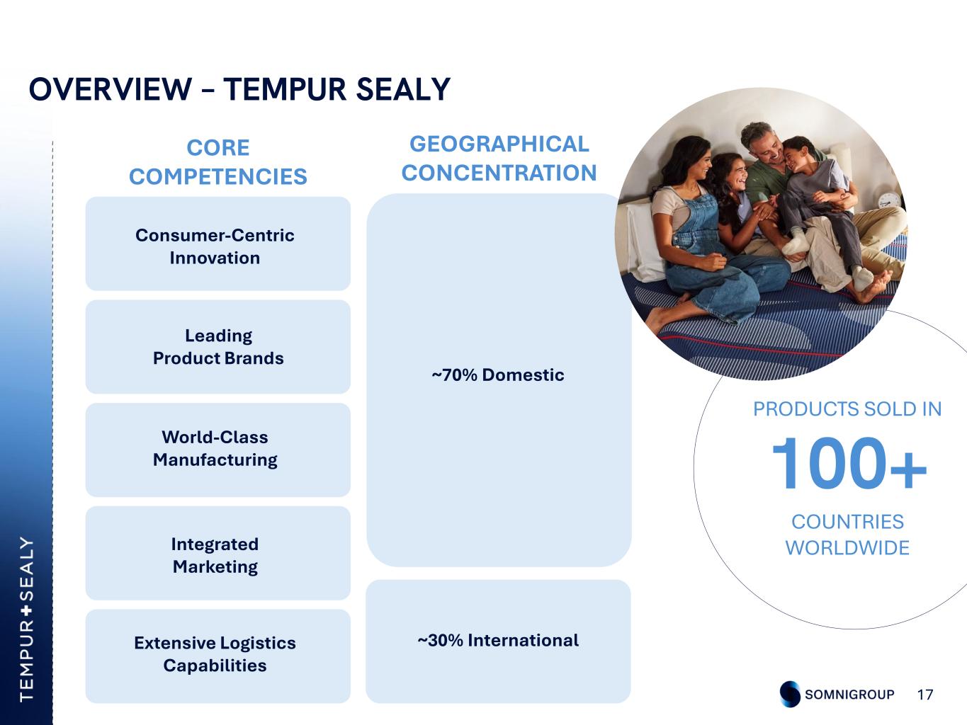 OVERVIEW – TEMPUR SEALY 17 CORE COMPETENCIES GEOGRAPHICAL CONCENTRATION PRODUCTS SOLD IN 100+ COUNTRIES WORLDWIDE Consumer-Centric Innovation Leading Product Brands World-Class Manufacturing Integrated Marketing Extensive Logistics Capabilities ~70% Domestic ~30% International