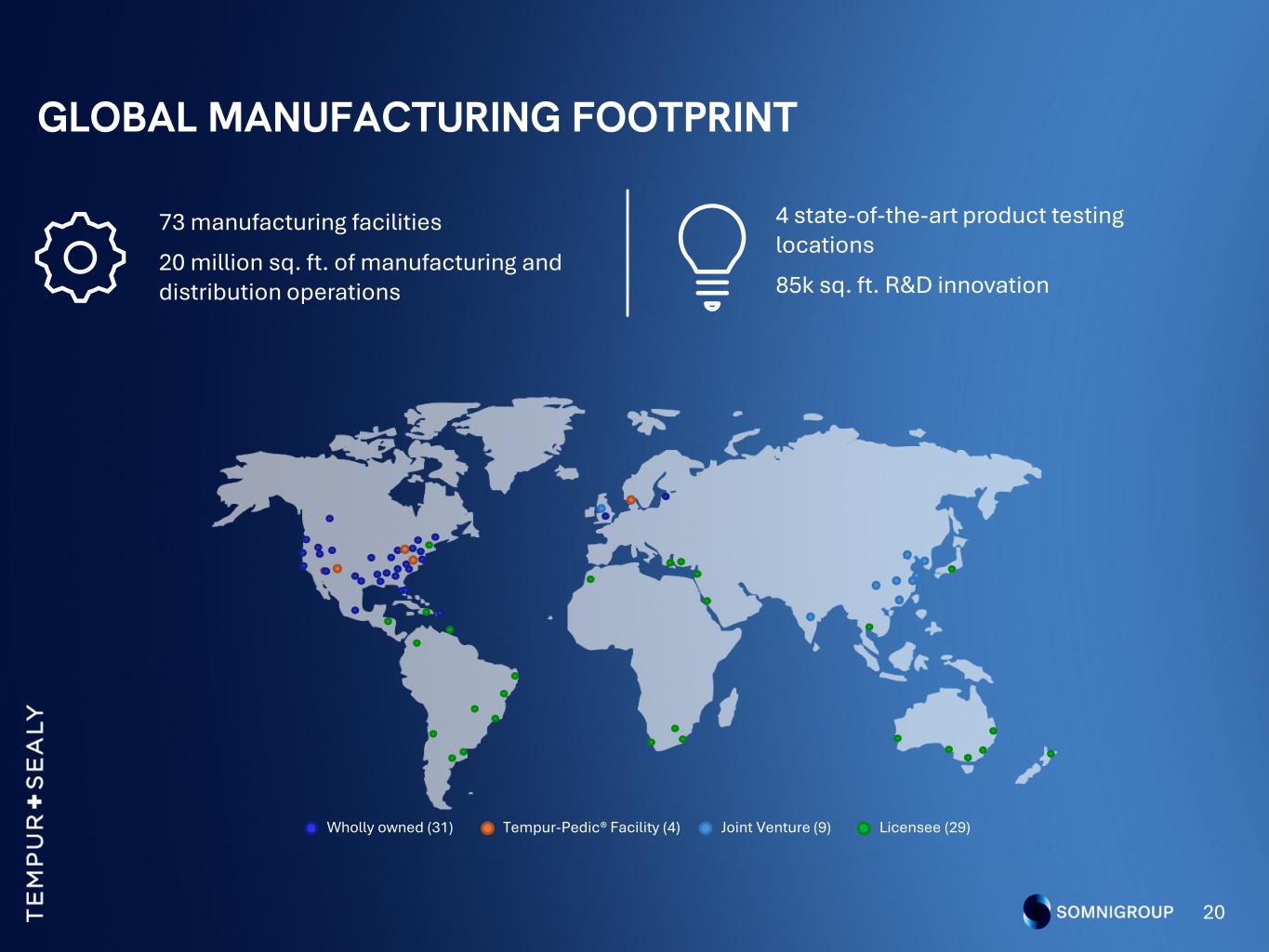 GLOBAL MANUFACTURING FOOTPRINT 20 73 manufacturing facilities 20 million sq. ft. of manufacturing and distribution operations 4 state-of-the-art product testing locations 85k sq. ft. R&D innovation Wholly owned (31) Joint Venture (9) Licensee (29)Tempur-Pedic® Facility (4)