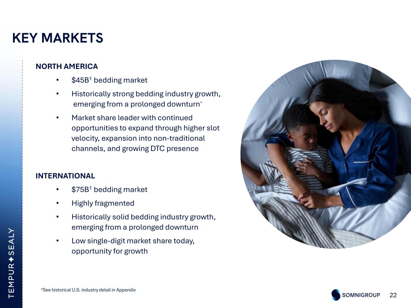 KEY MARKETS 22 NORTH AMERICA • $45B1 bedding market • Historically strong bedding industry growth, emerging from a prolonged downturn* • Market share leader with continued opportunities to expand through higher slot velocity, expansion into non-traditional channels, and growing DTC presence INTERNATIONAL • $75B1 bedding market • Highly fragmented • Historically solid bedding industry growth, emerging from a prolonged downturn • Low single-digit market share today, opportunity for growth *See historical U.S. industry detail in Appendix
