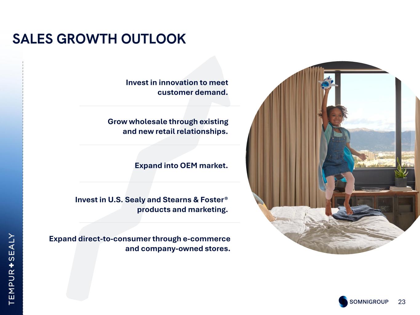 SALES GROWTH OUTLOOK 23 Expand into OEM market. Grow wholesale through existing and new retail relationships. Invest in innovation to meet customer demand. Expand direct-to-consumer through e-commerce and company-owned stores. Invest in U.S. Sealy and Stearns & Foster® products and marketing.