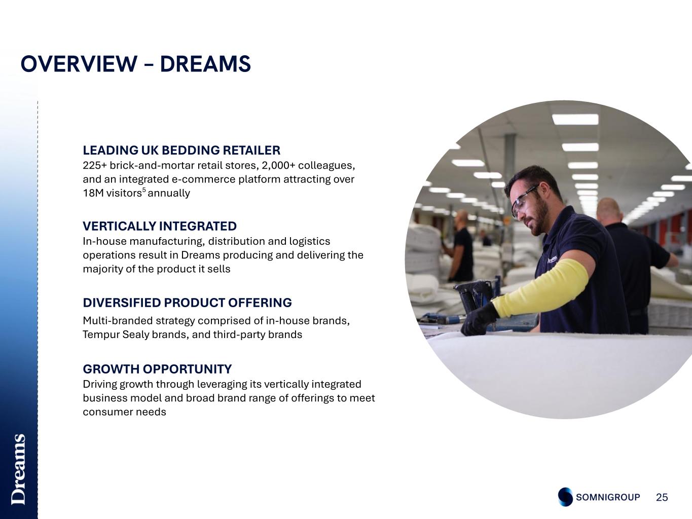 DIVERSIFIED PRODUCT OFFERING Multi-branded strategy comprised of in-house brands, Tempur Sealy brands, and third-party brands OVERVIEW – DREAMS 25 LEADING UK BEDDING RETAILER 225+ brick-and-mortar retail stores, 2,000+ colleagues, and an integrated e-commerce platform attracting over 18M visitors5 annually VERTICALLY INTEGRATED In-house manufacturing, distribution and logistics operations result in Dreams producing and delivering the majority of the product it sells GROWTH OPPORTUNITY Driving growth through leveraging its vertically integrated business model and broad brand range of offerings to meet consumer needs