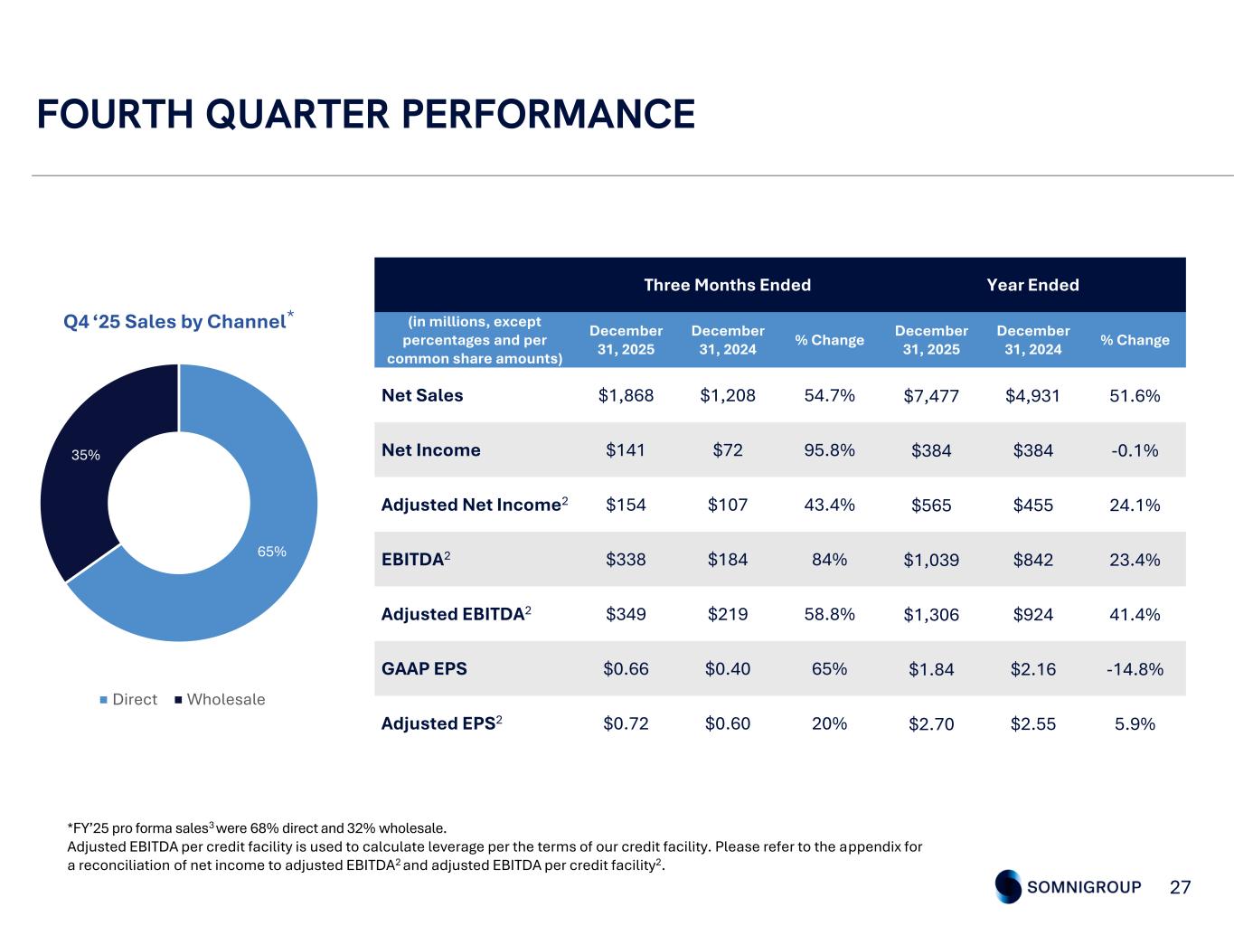 FOURTH QUARTER PERFORMANCE 27 Three Months Ended Year Ended (in millions, except percentages and per common share amounts) December 31, 2025 December 31, 2024 % Change December 31, 2025 December 31, 2024 % Change Net Sales $1,868 $1,208 54.7% $7,477 $4,931 51.6% Net Income $141 $72 95.8% $384 $384 -0.1% Adjusted Net Income2 $154 $107 43.4% $565 $455 24.1% EBITDA2 $338 $184 84% $1,039 $842 23.4% Adjusted EBITDA2 $349 $219 58.8% $1,306 $924 41.4% GAAP EPS $0.66 $0.40 65% $1.84 $2.16 -14.8% Adjusted EPS2 $0.72 $0.60 20% $2.70 $2.55 5.9% Q4 ‘25 Sales by Channel* *FY’25 pro forma sales3 were 68% direct and 32% wholesale. Adjusted EBITDA per credit facility is used to calculate leverage per the terms of our credit facility. Please refer to the appendix for a reconciliation of net income to adjusted EBITDA2 and adjusted EBITDA per credit facility2. 65% 35% Direct Wholesale