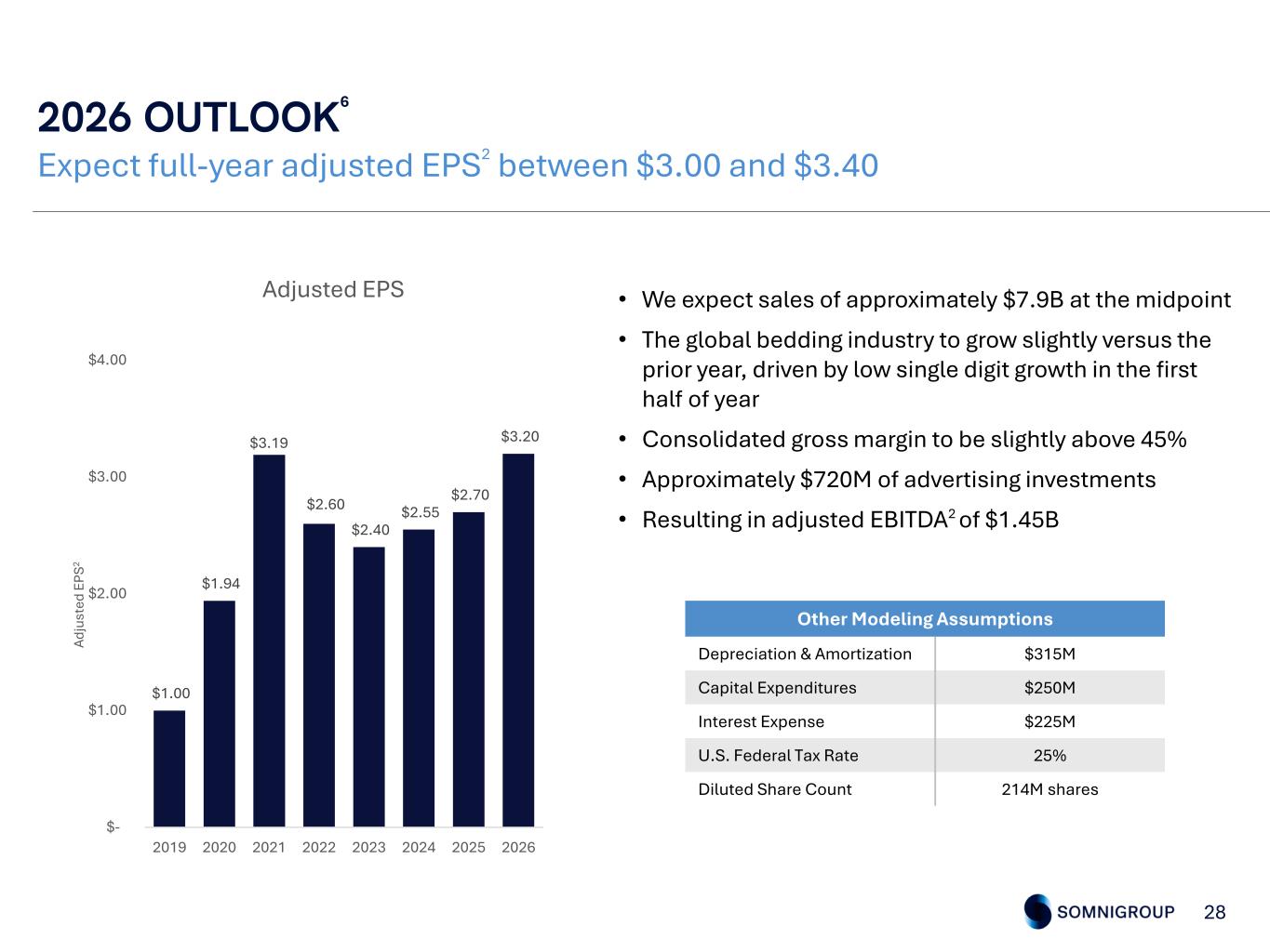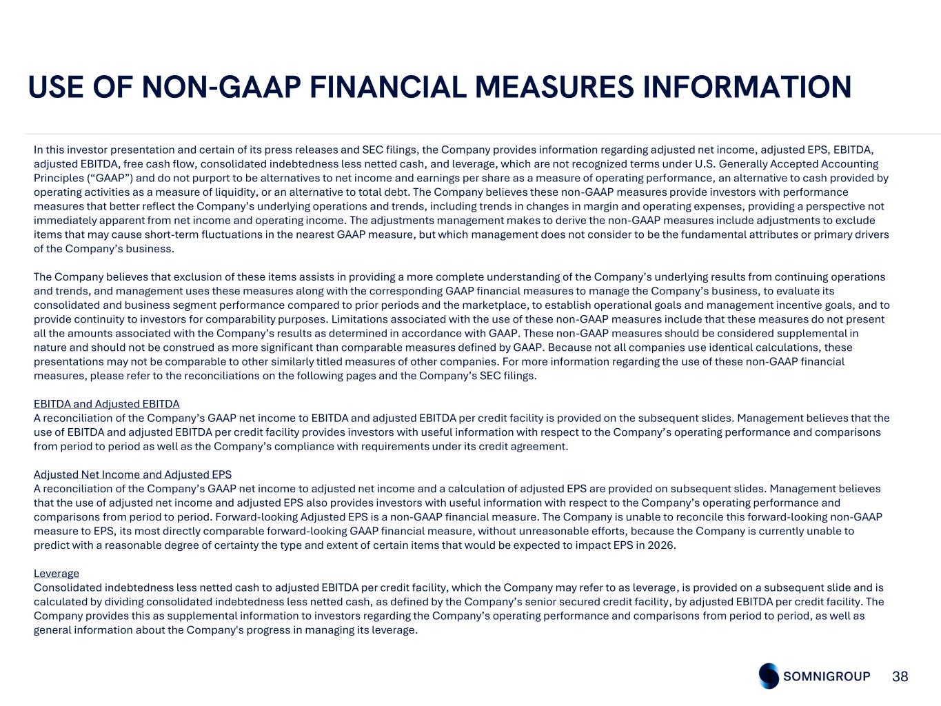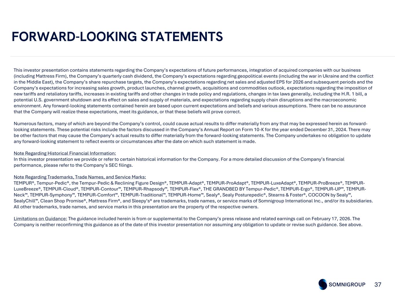 37 This investor presentation contains statements regarding the Company’s expectations of future performances, integration of acquired companies with our business (including Mattress Firm), the Company’s quarterly cash dividend, the Company’s expectations regarding geopolitical events (including the war in Ukraine and the conflict in the Middle East), the Company’s share repurchase targets, the Company’s expectations regarding net sales and adjusted EPS for 2026 and subsequent periods and the Company’s expectations for increasing sales growth, product launches, channel growth, acquisitions and commodities outlook, expectations regarding the imposition of new tariffs and retaliatory tariffs, increases in existing tariffs and other changes in trade policy and regulations, changes in tax laws generally, including the H.R. 1 bill, a potential U.S. government shutdown and its effect on sales and supply of materials, and expectations regarding supply chain disruptions and the macroeconomic environment. Any forward-looking statements contained herein are based upon current expectations and beliefs and various assumptions. There can be no assurance that the Company will realize these expectations, meet its guidance, or that these beliefs will prove correct. Numerous factors, many of which are beyond the Company’s control, could cause actual results to differ materially from any that may be expressed herein as forward- looking statements. These potential risks include the factors discussed in the Company’s Annual Report on Form 10-K for the year ended December 31, 2024. There may be other factors that may cause the Company’s actual results to differ materially from the forward-looking statements. The Company undertakes no obligation to update any forward-looking statement to reflect events or circumstances after the date on which such statement is made. Note Regarding Historical Financial Information: In this investor presentation we provide or refer to certain historical information for the Company. For a more detailed discussion of the Company’s financial performance, please refer to the Company’s SEC filings. Note Regarding Trademarks, Trade Names, and Service Marks: TEMPUR®, Tempur-Pedic®, the Tempur-Pedic & Reclining Figure Design®, TEMPUR-Adapt®, TEMPUR-ProAdapt®, TEMPUR-LuxeAdapt®, TEMPUR-ProBreeze®, TEMPUR- LuxeBreeze®, TEMPUR-Cloud®, TEMPUR-Contour , TEMPUR-Rhapsody , TEMPUR-Flex®, THE GRANDBED BY Tempur-Pedic®, TEMPUR-Ergo®, TEMPUR-UP , TEMPUR- Neck , TEMPUR-Symphony , TEMPUR-Comfort , TEMPUR-Traditional , TEMPUR-Home , Sealy®, Sealy Posturepedic®, Stearns & Foster®, COCOON by Sealy , SealyChill , Clean Shop Promise®, Mattress Firm®, and Sleepy’s® are trademarks, trade names, or service marks of Somnigroup International Inc., and/or its subsidiaries. All other trademarks, trade names, and service marks in this presentation are the property of the respective owners. Limitations on Guidance: The guidance included herein is from or supplemental to the Company’s press release and related earnings call on February 17, 2026. The Company is neither reconfirming this guidance as of the date of this investor presentation nor assuming any obligation to update or revise such guidance. See above. FORWARD-LOOKING STATEMENTS