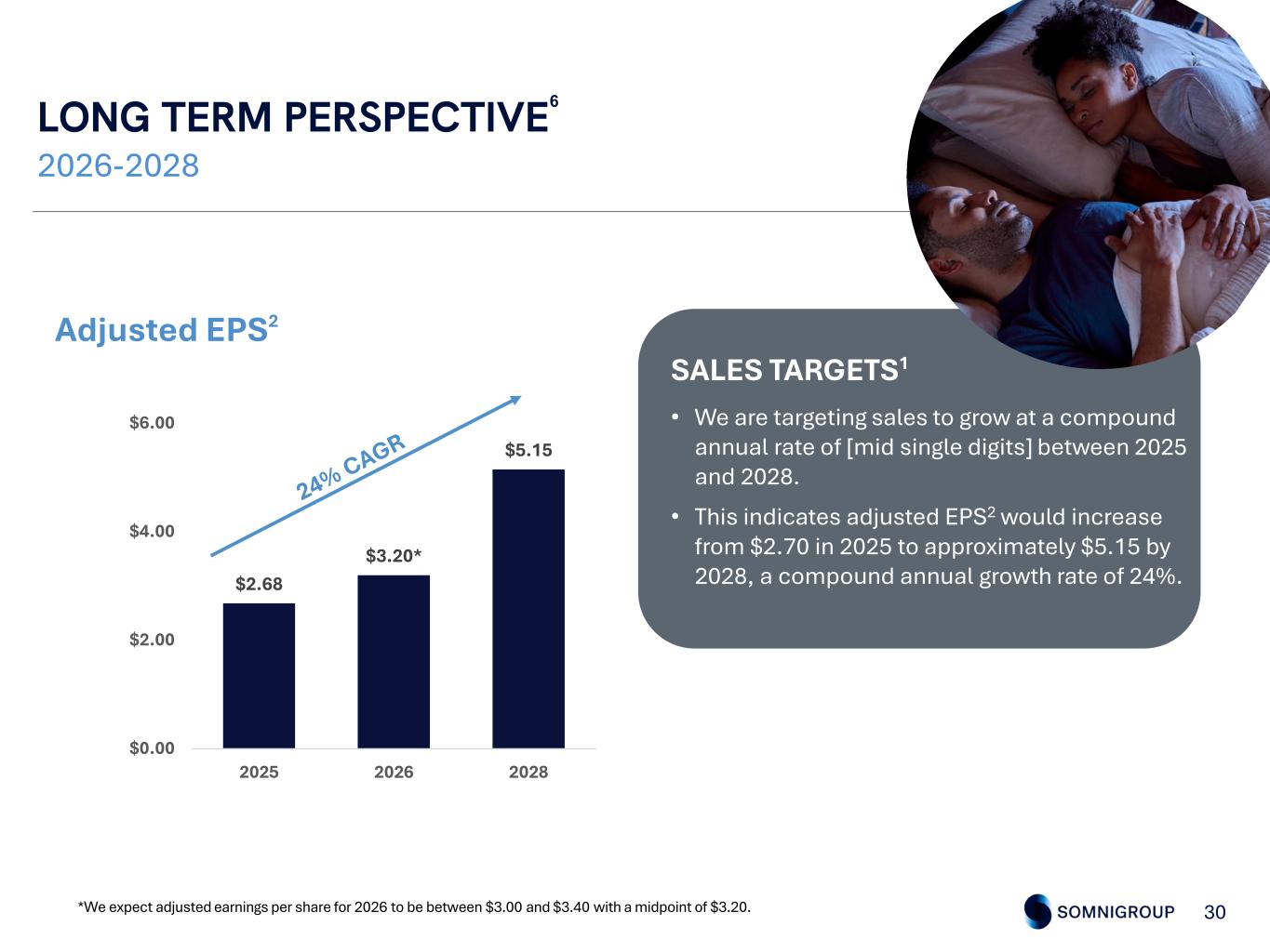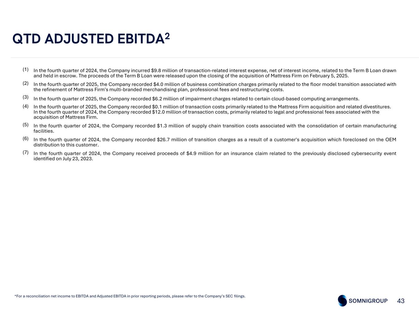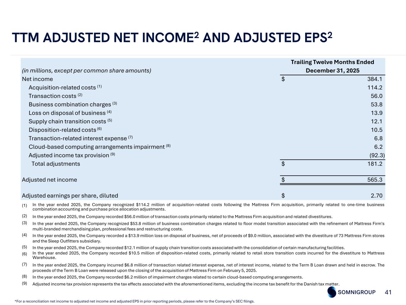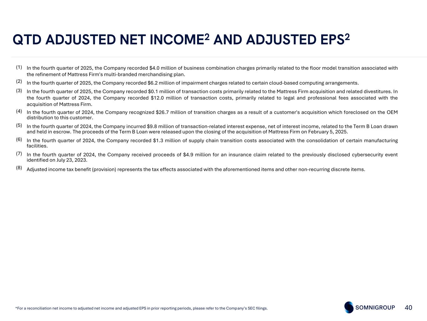 40 QTD ADJUSTED NET INCOME2 AND ADJUSTED EPS2 *For a reconciliation net income to adjusted net income and adjusted EPS in prior reporting periods, please refer to the Company’s SEC filings. (1) In the fourth quarter of 2025, the Company recorded $4.0 million of business combination charges primarily related to the floor model transition associated with the refinement of Mattress Firm's multi-branded merchandising plan. (2) In the fourth quarter of 2025, the Company recorded $6.2 million of impairment charges related to certain cloud-based computing arrangements. (3) In the fourth quarter of 2025, the Company recorded $0.1 million of transaction costs primarily related to the Mattress Firm acquisition and related divestitures. In the fourth quarter of 2024, the Company recorded $12.0 million of transaction costs, primarily related to legal and professional fees associated with the acquisition of Mattress Firm. (4) In the fourth quarter of 2024, the Company recognized $26.7 million of transition charges as a result of a customer's acquisition which foreclosed on the OEM distribution to this customer. (5) In the fourth quarter of 2024, the Company incurred $9.8 million of transaction-related interest expense, net of interest income, related to the Term B Loan drawn and held in escrow. The proceeds of the Term B Loan were released upon the closing of the acquisition of Mattress Firm on February 5, 2025. (6) In the fourth quarter of 2024, the Company recorded $1.3 million of supply chain transition costs associated with the consolidation of certain manufacturing facilities. (7) In the fourth quarter of 2024, the Company received proceeds of $4.9 million for an insurance claim related to the previously disclosed cybersecurity event identified on July 23, 2023. (8) Adjusted income tax benefit (provision) represents the tax effects associated with the aforementioned items and other non-recurring discrete items.