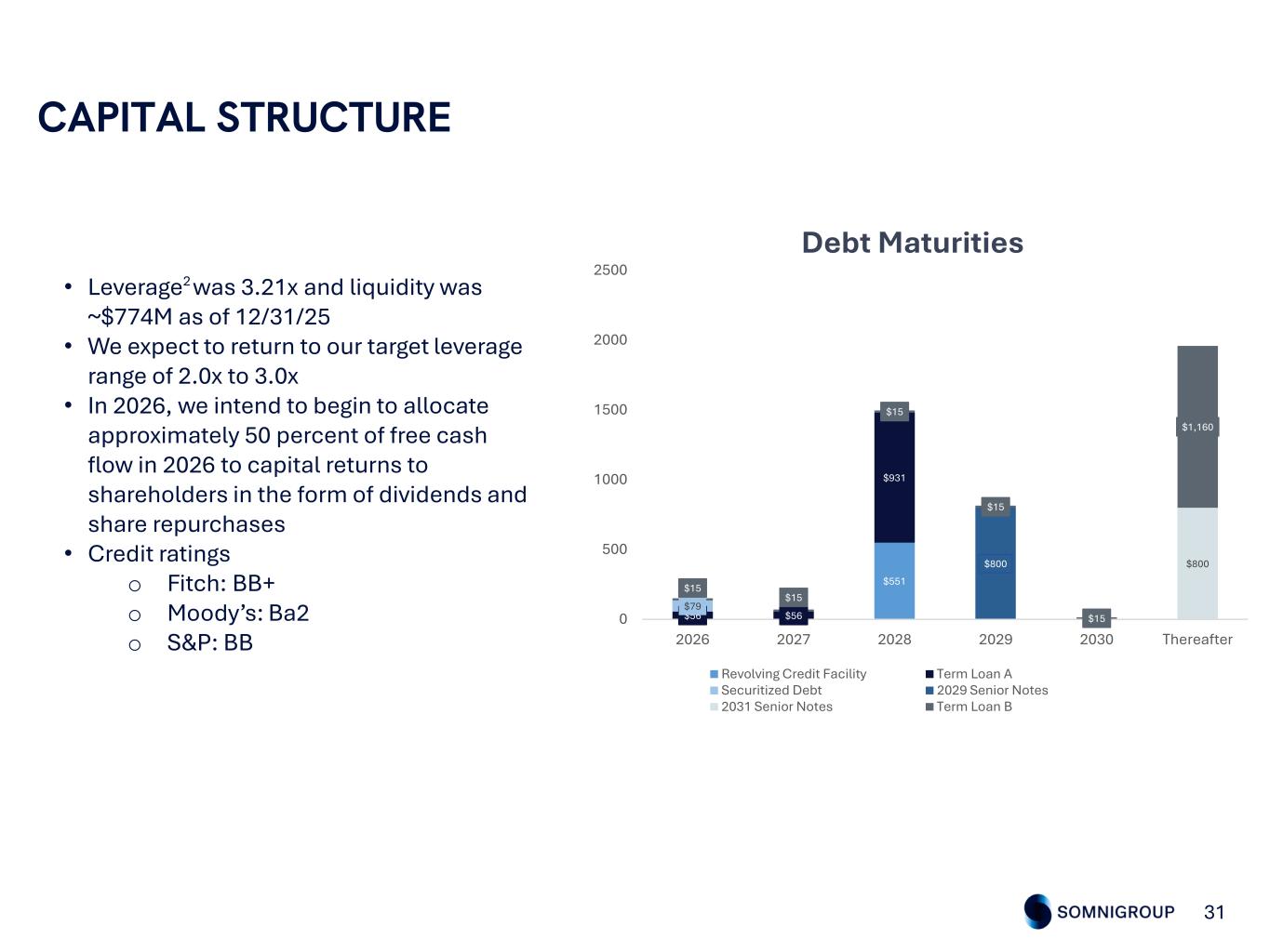 CAPITAL STRUCTURE 31 • Leverage2 was 3.21x and liquidity was ~$774M as of 12/31/25 • We expect to return to our target leverage range of 2.0x to 3.0x • In 2026, we intend to begin to allocate approximately 50 percent of free cash flow in 2026 to capital returns to shareholders in the form of dividends and share repurchases • Credit ratings o Fitch: BB+ o Moody’s: Ba2 o S&P: BB $551 $56 $56 $931 $79 $800 $800 $15 $15 $15 $15 $15 $1,160 0 500 1000 1500 2000 2500 2026 2027 2028 2029 2030 Thereafter Debt Maturities Revolving Credit Facility Term Loan A Securitized Debt 2029 Senior Notes 2031 Senior Notes Term Loan B