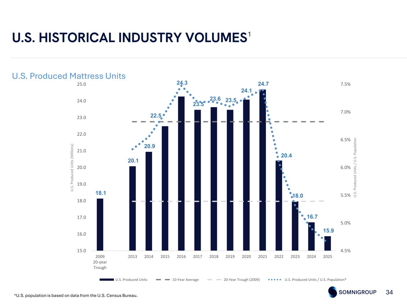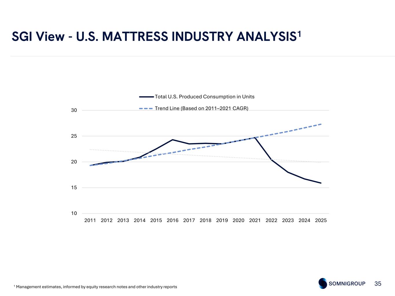 SGI View - U.S. MATTRESS INDUSTRY ANALYSIS1 35Source: ISPA, U.S. ITC, management estimates 10 15 20 25 30 2011 2012 2013 2014 2015 2016 2017 2018 2019 2020 2021 2022 2023 2024 2025 Total U.S. Produced Consumption in Units Trend Line (Based on 2011–2021 CAGR) 1 Management estimates, informed by equity research notes and other industry reports